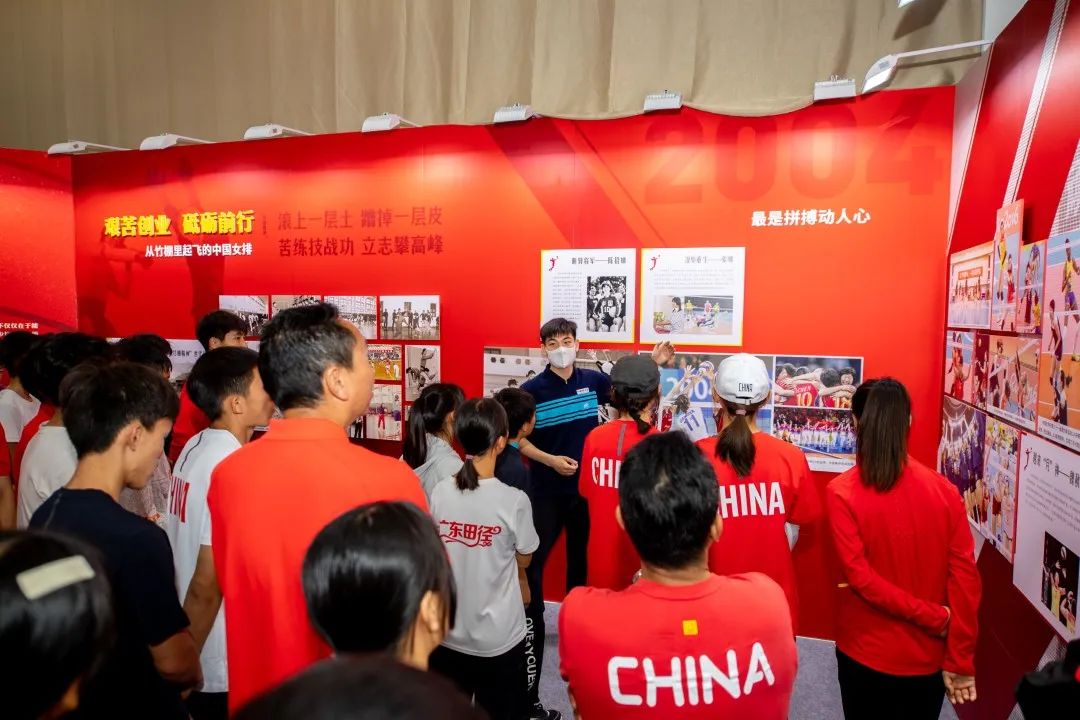 女排精神代表着一个时代的精神,喊出了为中华崛起而拼搏的时代最强音。在中国排球学院一楼大厅,摆放着的展板,详细描绘了中国女排40年来勇夺十次世界冠军的光辉历史和拼搏之路。刘亚带领训练营教练员、运动员,参观了祖国至上、团结协作、顽强拼搏、永不言败四个板块的内容,李国梁为教练员和运动员们讲述了女排姑娘们为了集体荣誉拼搏奋斗的故事。