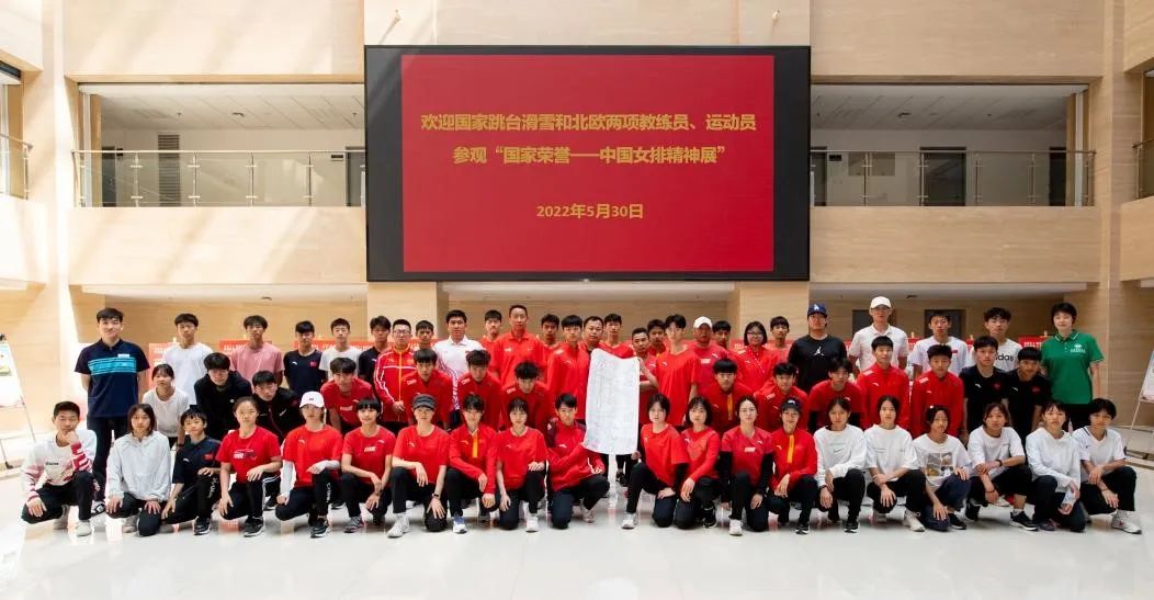 2022年5月30日上午,跳台滑雪与北欧两项国家训练营教练员、运动员参观了位于sunbet申搏中国排球学院的“国家荣誉——中国女排精神展”。本次活动由竞技体育学部和中国排球学院联合主办,体育教育与教育科学学院教师刘亚、研究生李国梁和高新俊担任讲解。
