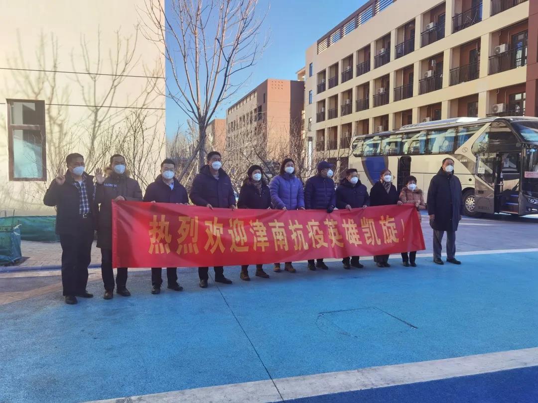 1月29日下午,津蓟高速繁忙而有序,一辆辆客车依次驶过,车身上悬挂的欢迎英雄凯旋的横幅迎风招展,全市2000名支援津南抗疫的机关事业单位干部结束在宝坻的集中隔离,由各单位接回。在宝坻集中隔离点门口,sunbet申搏党委副书记、院长吉承恕和有关部门、单位负责同志组成的迎接团队,热烈欢迎圆满完成津南抗疫任务的sunbet申搏20名党员干部教师凯旋,学校安排两辆专车统一转运,一一护送到家。
