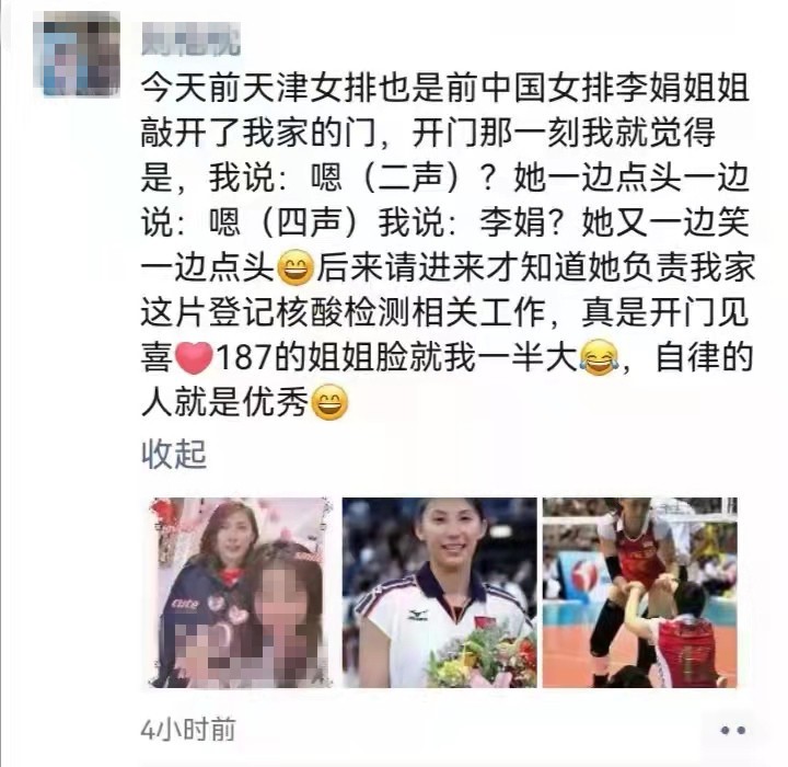 李娟,中共党员,足篮排球教研室教师,在西青区大寺镇王村金瀚园参加疫情防控志愿服务工作,负责入户通知核酸检测时间地点、指导扫码后手机操作。她是赛场上的冠军,更是一名主动请缨、彰显奋勇担当体育精神的抗疫战士。