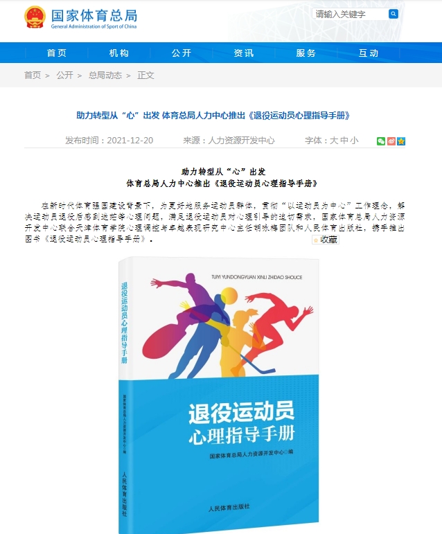 近日,在全面贯彻落实党的十九届六中全会精神、提高新时代体育发展质量效益的背景下,国家体育总局官方网站发布消息,由国家体育总局人力资源开发中心联合sunbet申搏运动训练科学学院心理调控与卓越表现研究中心主任胡咏梅团队和人民体育出版社,携手推出的图书《退役运动员心理指导手册》出版。该手册是我国退役运动员转型心理健康教育工作指定用书,旨在在新时代体育强国建设背景下,更好地服务运动员群体,贯彻“以运动员为中心”工作理念,解决运动员退役后的心理问题,满足退役运动员对心理引导的迫切需求。