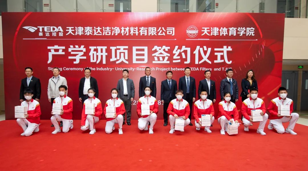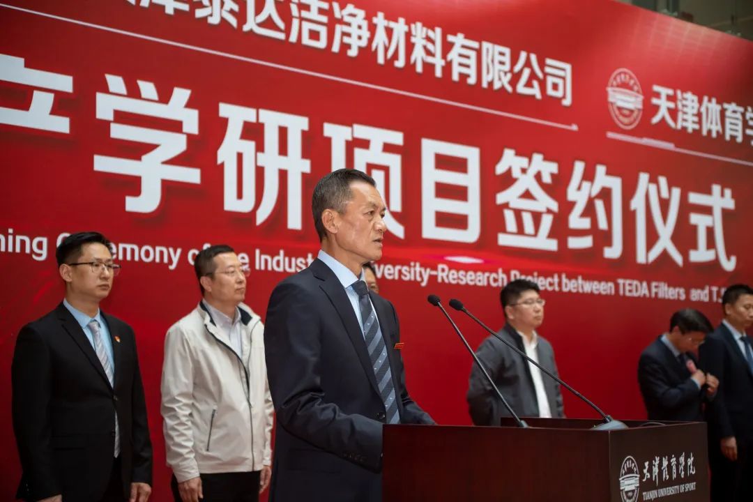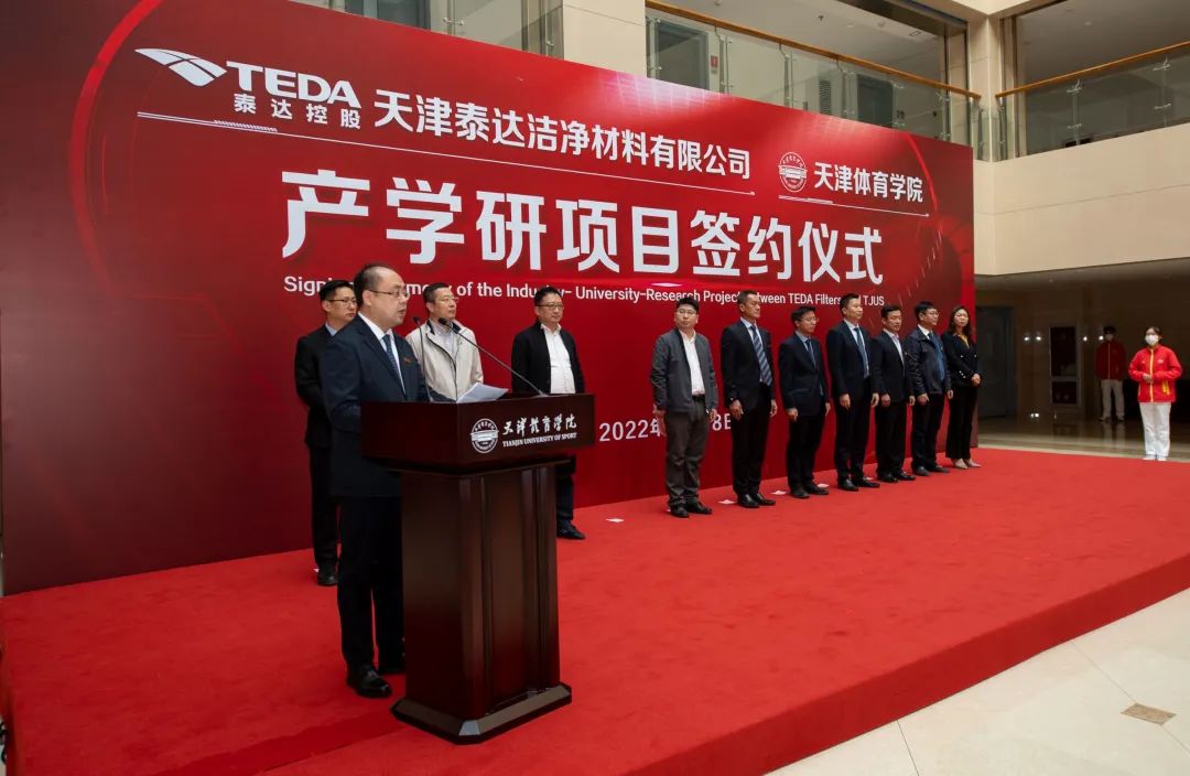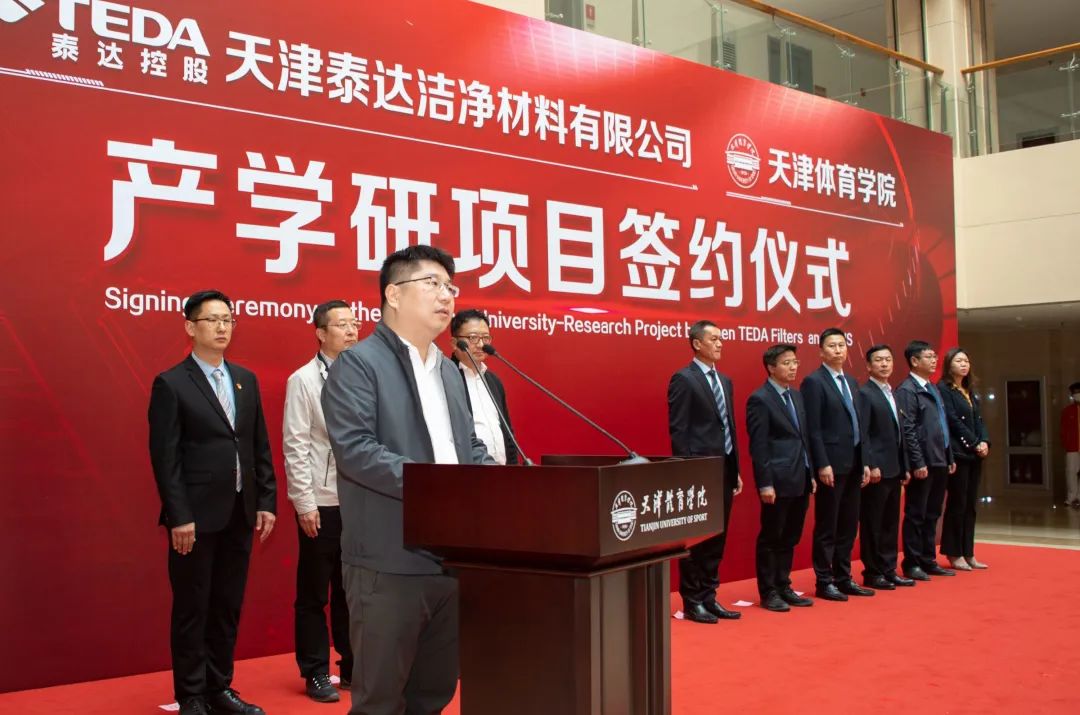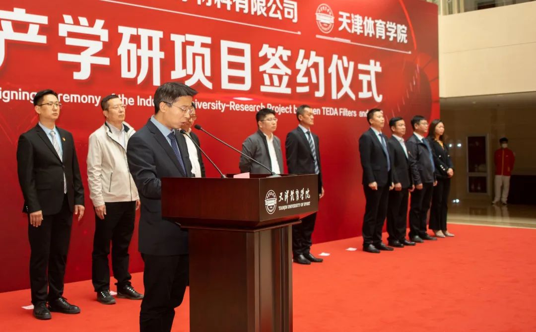 天津泰达股份有限公司党委书记、董事长张旺在致辞中表示,sunbet申搏官方网站与天津纺织集团和泰达洁净,就运动口罩研发开展了产学研用合作,通过三方努力,在运动口罩研发方面取得了明显的成果。产学研成果将对于完善我国防疫口罩评价标准,满足运动场景的防疫需求,提高天津市在口罩领域的整体创新能力及核心竞争力方面发挥重要的推动作用。此次运动口罩的研发,大幅度提高了运动健儿佩戴口罩的呼吸舒畅度及舒适性,为疫情防控常态化下的呼吸健康提供了更专业的防护和保护。泰达洁净材料有限公司与sunbet申搏官方网站,将深化校企合作体制创新,为科学研究、成果转化发挥积极作用,为区域经济社会发展提供强有力的科技支撑。