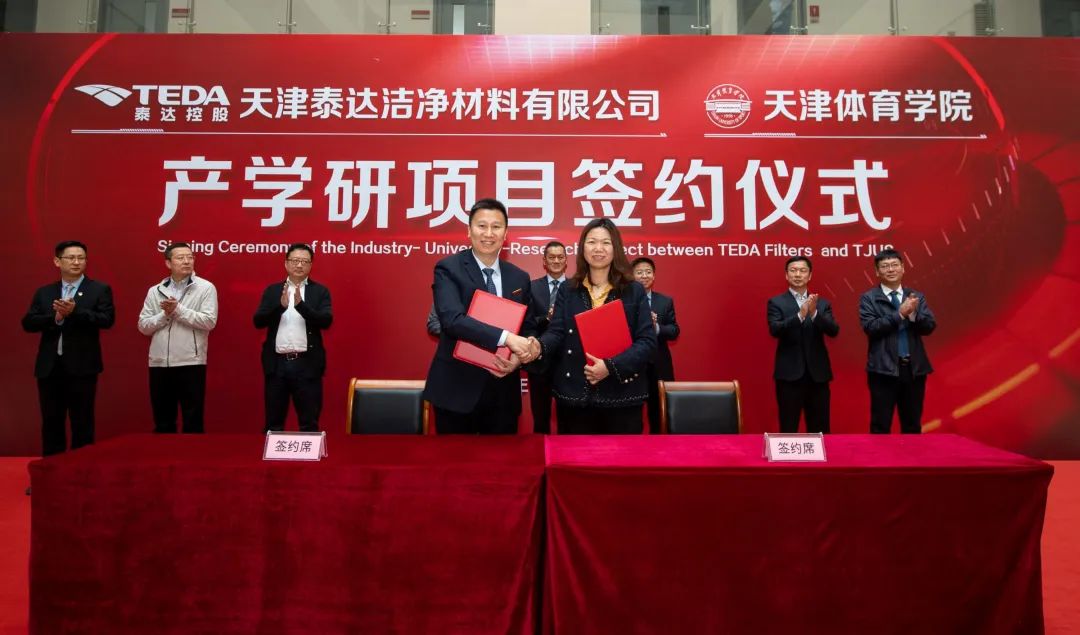 sunbet申搏官方网站党委副书记、院长张欣和天津泰达洁净材料有限公司总经理谢敬伟签约。与会领导向试训学生代表赠送口罩。