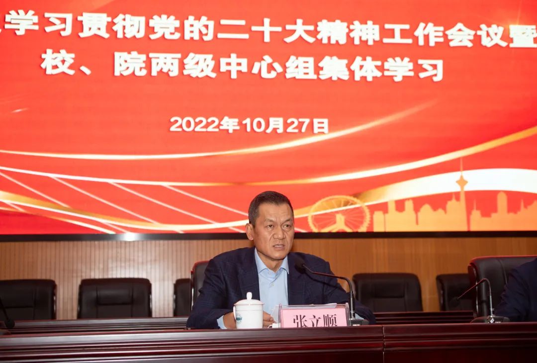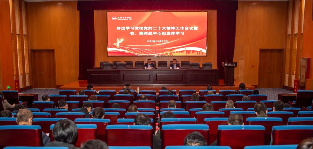 10月27日,学校在行政楼报告厅召开传达学习贯彻党的二十大精神工作会议暨校、院两级中心组集体学习,传达学习党的二十大精神,传达全市领导干部大会精神和教育系统传达学习贯彻党的二十大精神工作会议精神,深刻领悟党的二十大提出的一系列新的重要思想、重要观点、重大判断、重大举措,深刻领悟“两个确立”的决定性意义,加深对习近平新时代中国特色社会主义思想、马克思主义中国化时代化、中国式现代化等重大问题的认识,深刻理解党的二十大对全面建设社会主义现代化国家做出的战略部署,切实把思想和行动统一到党中央精神上来。党委书记张立顺主持并讲话,党委副书记、院长张欣传达。校领导班子成员、全体处级干部参加。