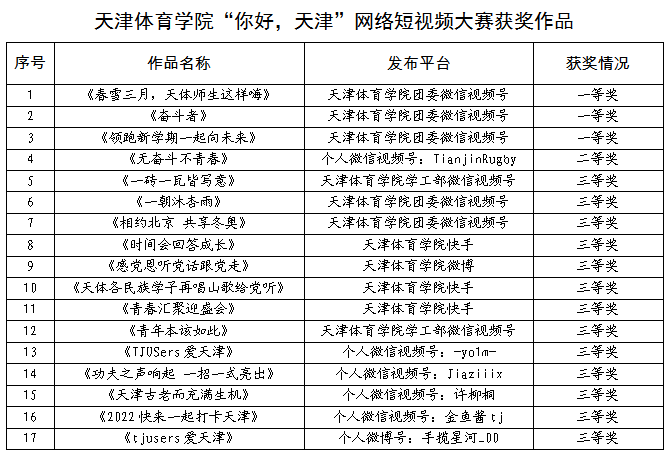《春雪三月,sunbet申搏师生这样嗨》《奋斗者》《领跑新学期一起向未来》获得一等奖。《无奋斗不青春》获得二等奖。《一砖一瓦皆写意》《一朝沐杏雨》《相约北京 共享冬奥》《时间会回答成长》《感党恩听党话跟党走》《sunbet申搏各民族学子再唱山歌给党听》《青春汇聚迎盛会》《青年本该如此》《TJUSers爱天津》《功夫之声响起 一招一式亮出》《天津古老而充满生机》《2022快来一起打卡天津》《tjusers爱天津》获得三等奖。