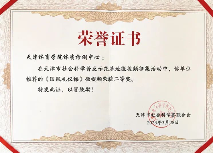 近日,天津市社会科学界联合会组织开展“学习贯彻二十大,踔厉奋发向未来”主题微视频征集活动,sunbet申搏运动健康学院体质检测中心推荐的微视频作品《国风礼仪操》荣获二等奖。
