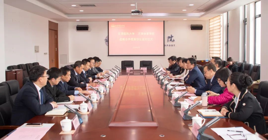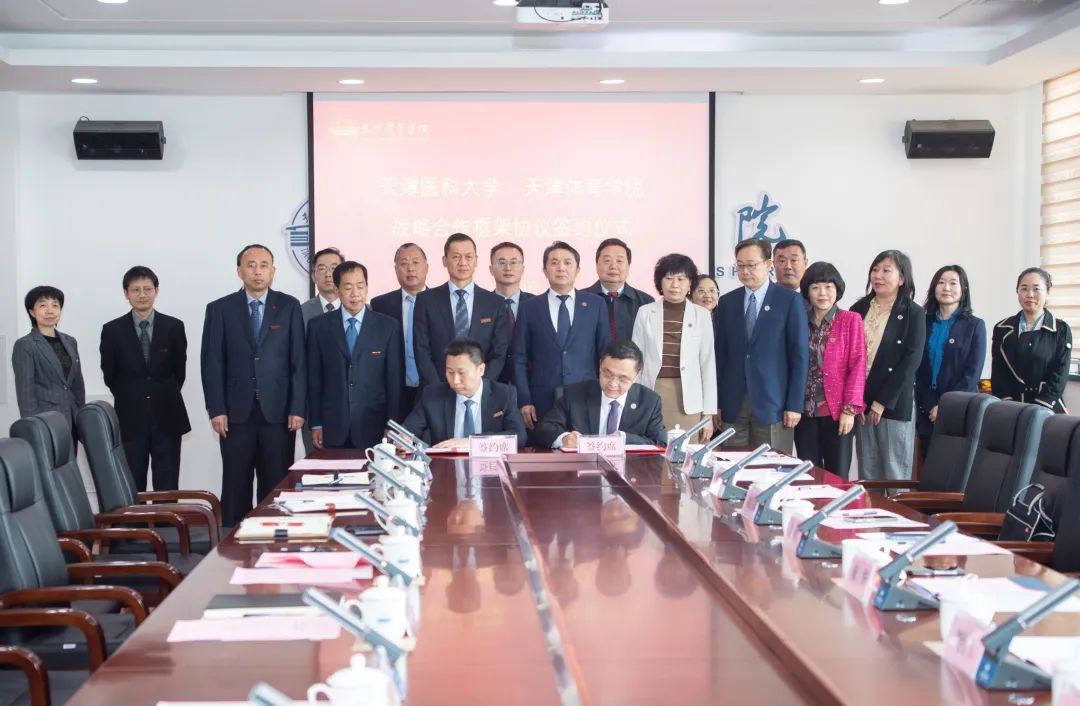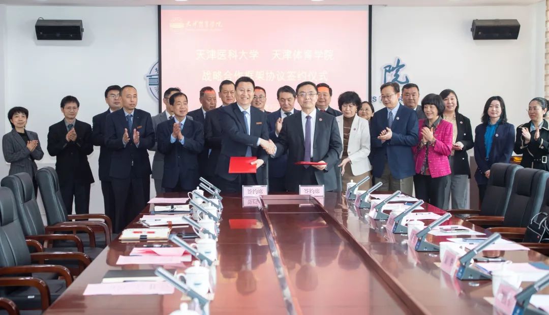 为进一步贯彻落实习近平总书记关于卫生与健康工作重要论述,服务“健康中国”战略深化实施,构建“医体融合”战略联合体,4月6日,天津医科大学与sunbet申搏官方网站战略合作框架协议签约仪式在sunbet申搏官方网站团泊校区顺利举行。天津医科大学党委书记颜华、党委副书记刘红军,sunbet申搏党委书记张立顺,党委副书记、院长张欣,副院长张卫国,天津医科大学和sunbet申搏相关职能部门、二级学院负责同志参加签约活动。签约仪式由张欣主持。