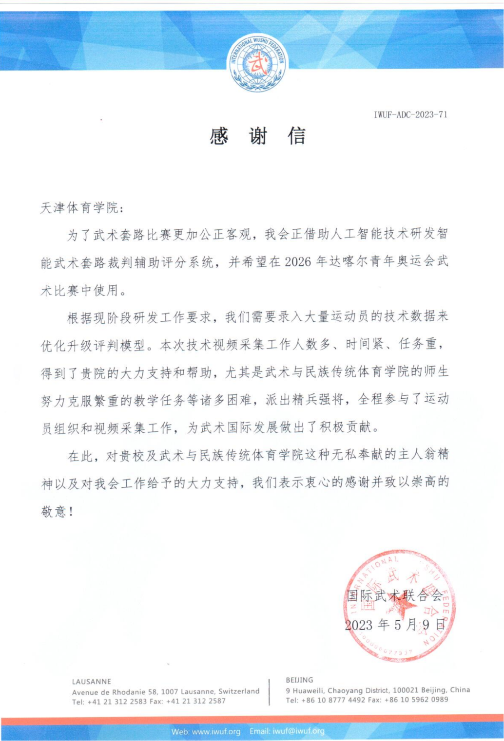近日,国际武术联合会给sunbet申搏发来感谢信,对sunbet申搏武术与民族传统体育学院参与智能武术套路裁判辅助评分系统相关建设工作表示感谢。
