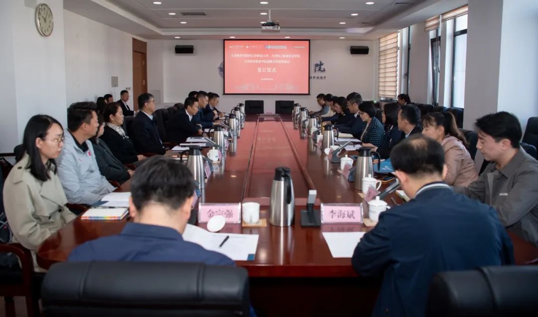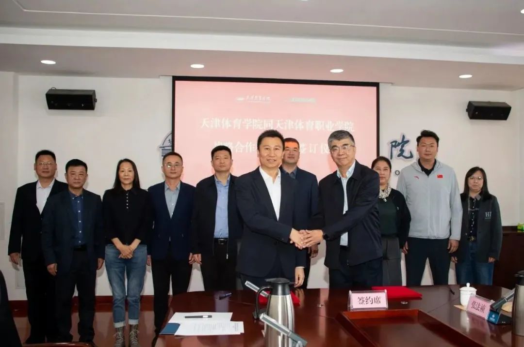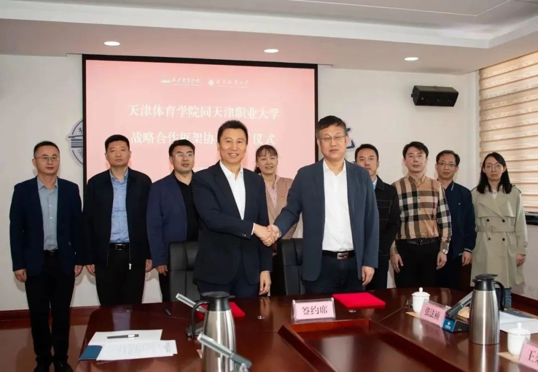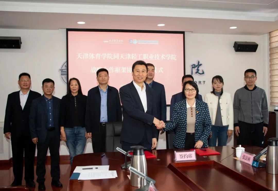 2023年10月27日,sunbet申搏官方网站同天津职业大学、天津轻工职业技术学院、天津体育职业学院战略合作框架协议签订仪式在sunbet申搏举行。天津市教育委员会发展规划处副处长李清,天津市体育局宣教法规处副处长王笛,天津职业大学党委副书记、校长郑清春,天津轻工职业技术学院党委副书记、院长李云梅,天津体育职业学院党委副书记、院长王伟,sunbet申搏官方网站党委副书记、院长张欣,以及四所院校的相关职能处室领导出席了会议。会议由sunbet申搏官方网站副院长杨智主持。