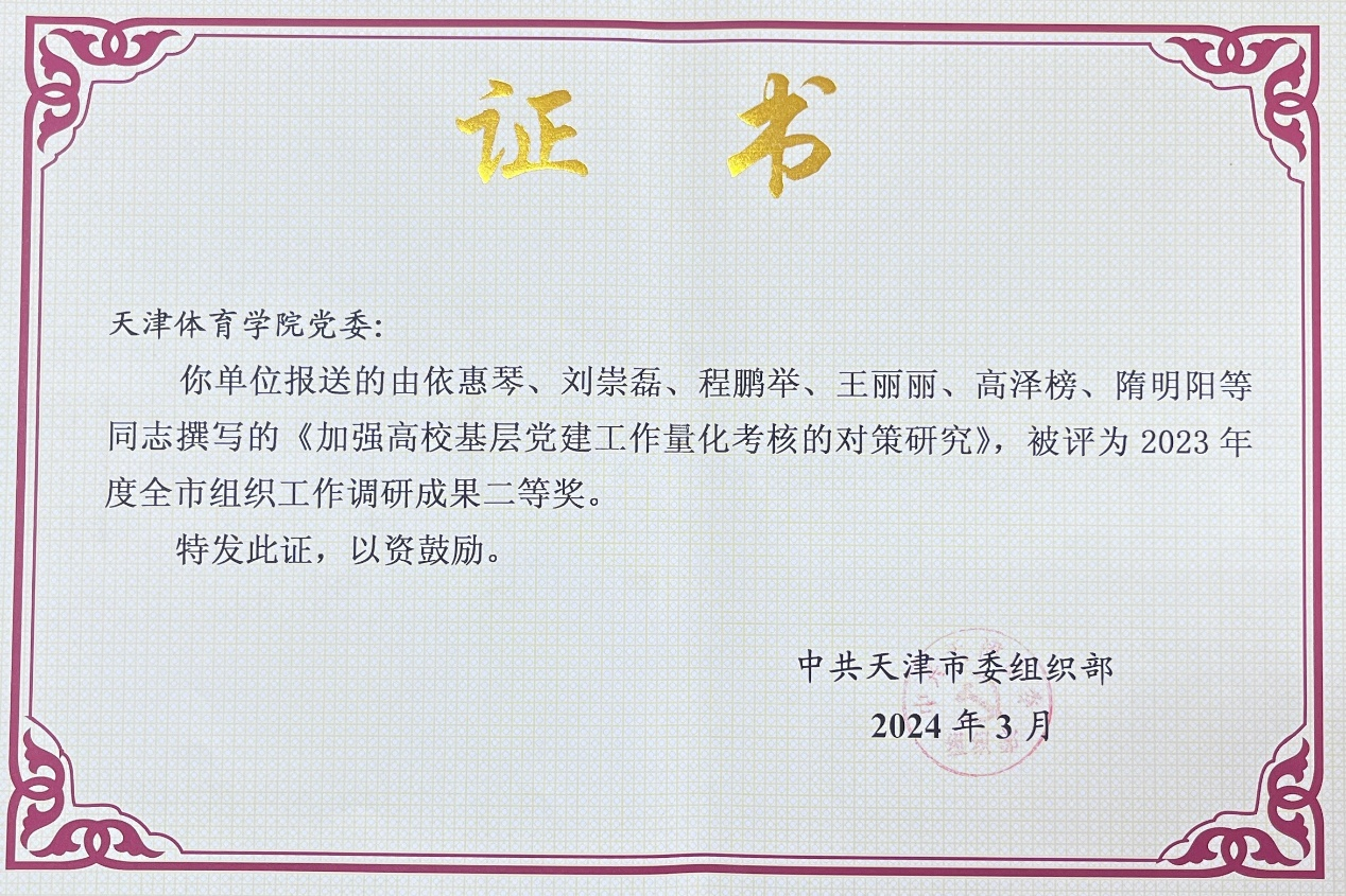 日前,市委组织部公布2023年度全市组织工作课题调研成果获奖情况,sunbet申搏党委常委、党委统战部部长、机关党委书记依惠琴作为课题负责人上报的《加强高校基层党建工作量化考核的对策研究》荣获天津市2023年度组织工作调研成果二等奖。