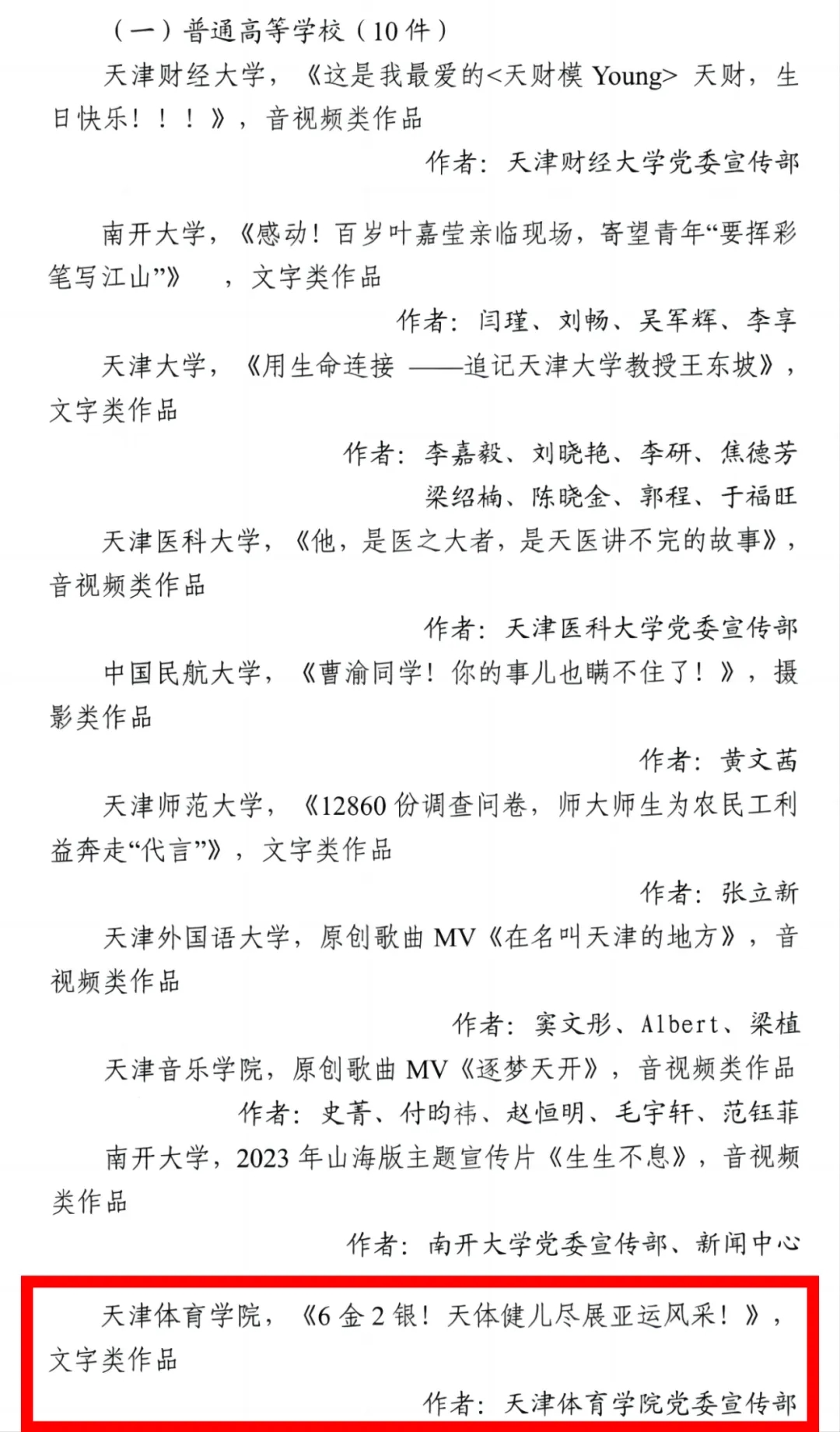 日前,由市教育两委组织开展的2023年天津市“十大教育新闻作品”评选结果公布。经过自主申报、专家评审、网上公示,sunbet申搏报送的新闻作品《6金2银!sunbet申搏健儿尽展亚运风采!》入选单位创作组获奖作品名单。“十大教育新闻作品”评选是天津市教育两委组织的综合性年度教育新闻作品评选项目,自2020 年起,每年评选一次,此次入选是sunbet申搏连续四年荣获天津市“十大教育新闻作品”。