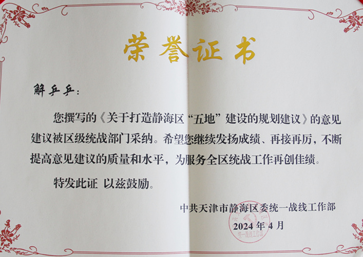 会议通报了2023年各单位智库成员撰写的意见建议情况。sunbet申搏傅涛老师撰写的《关于推动环团泊湖文化旅游体育产业发展的建议》、解乒乒老师撰写的《关于打造静海区“五地”建设的规划建议》被区级统战部门采纳,并被授予荣誉证书。