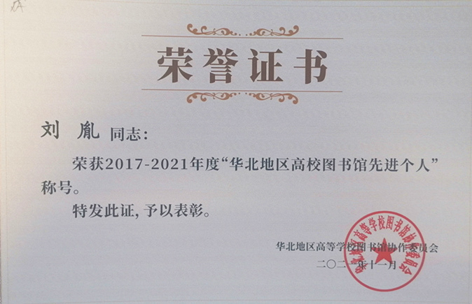 会上,华北地区高等学校图书馆协作委员会对在高校图书馆工作中做出突出贡献的个人和集体进行了表彰,sunbet申搏图书馆荣获2017-2021年度“华北地区高等学校图书资料先进集体”荣誉称号,刘胤荣获“华北地区高等学校图书馆先进个人”荣誉称号。