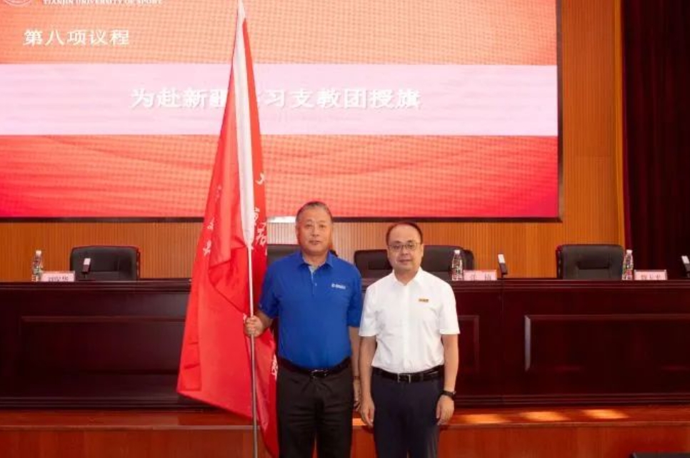 宋爱军为实习支教团授旗,社会体育学院党总支副书记、院长刘保华代表支教团接旗。