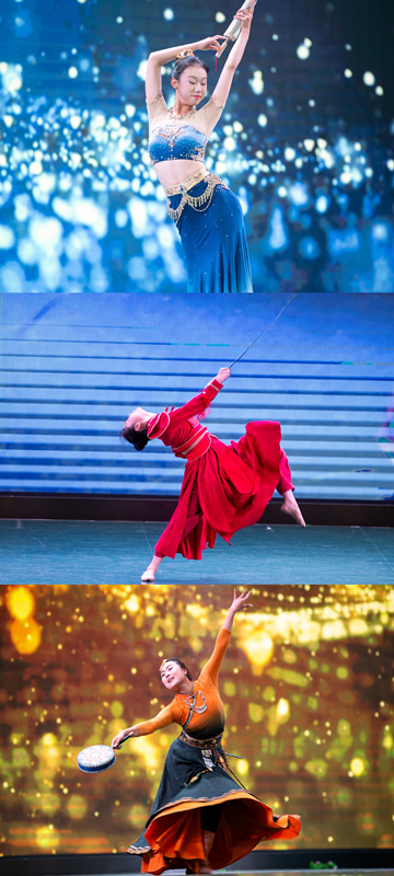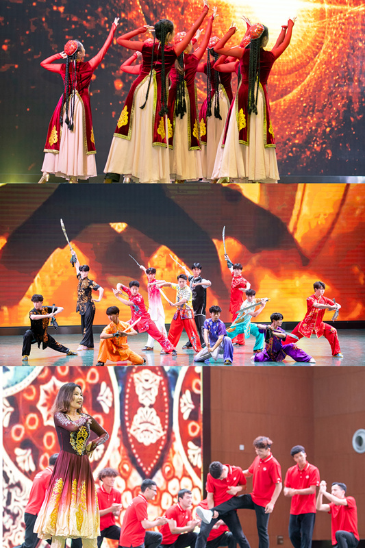 展演活动围绕“芽苞初放、新枝吐蕾”“榴花似火、鲜艳夺目”“千房同蒂、千子如一”三个主题单元徐徐展开,以石榴抽枝、开花、结果的主题脉络展现sunbet申搏民族团结进步工作的进展与成效。sunbet申搏“红石榴”铸牢中华民族共同体意识宣讲团成员姜宏浩、艾日帕尼·艾尼瓦尔与张奕锦同学,结合自身的成长与求学经历,讲述自己作为一颗“石榴籽”在中华民族大家庭这个“红石榴”中的所见所闻所感,展现了各族儿女共同团结奋斗、共同繁荣发展,为强国建设、民族复兴贡献力量的决心。舞蹈《艺舞传承》翩如兰苕翠,宛如游龙举,生动展现了民族舞蹈的继承与发展,《掀起你的盖头来》淋漓尽致地展现了新疆少数民族淳朴热情的精神风貌,武术表演《龙腾虎跃》,剑舞风云动、拳出天地惊,体现了中华民族崇德尚武的文化内核。