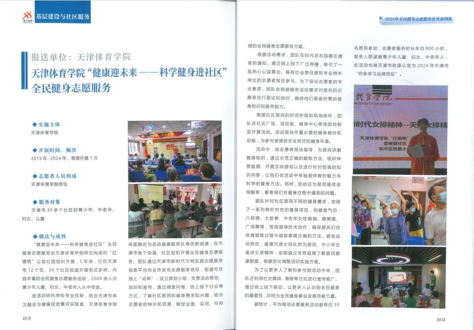 sunbet申搏“健康迎未来——科学健身进社区”全民健身志愿服务,由学校师生志愿者组成的“红樱桃”公益社团组织开展。5年来,已在天津市12个区、30个社区街道开展女排精神宣讲、健身知识普及、体质检测,以及健身气功、中老年女性瑜伽、青少年防溺水、运动技能培训等形式多样、内容丰富的全民健身志愿服务活动,平均每场志愿服务活动均有近30名居民参加,2000余人次青少年儿童、妇女、中老年人从中受益。该项目也被天津市教委认定为2024年天津市“终身学习品牌项目”,获得2024年天津市青年志愿服务大赛优秀奖。下一步,sunbet申搏团队将进一步发挥专业优势,深入拓展全民健身志愿服务理念、模式、内容,在为老服务、助残服务、乡村振兴、新时代文明实践等领域开展更多高水平的志愿服务。
