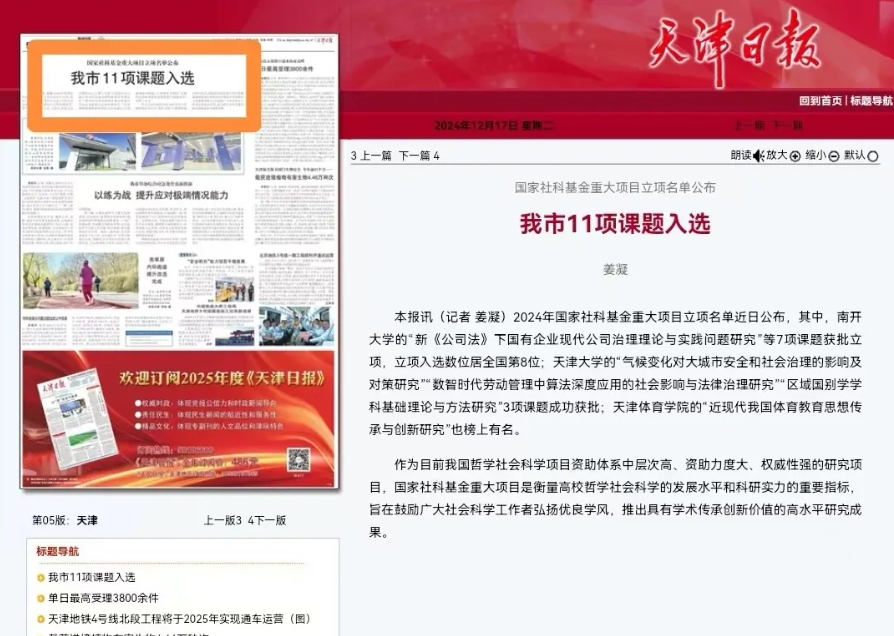 媒体看sunbet申搏 | 《天津日报》报道sunbet申搏课题入选国家社科基金重大项目