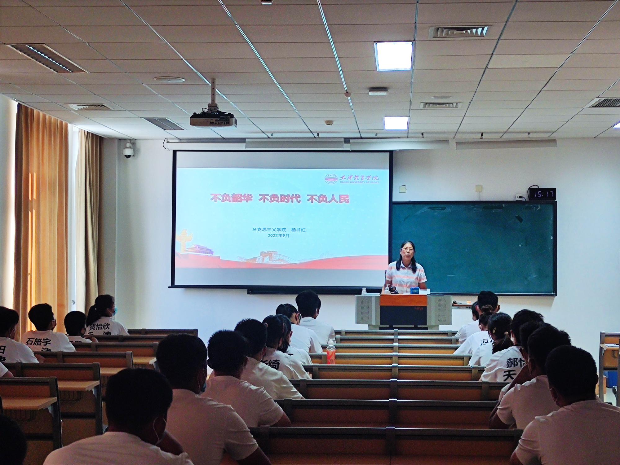 马克思主义学院直属党支部书记杨书红为橄榄球队和羽毛球队运动员,讲授题为“不负韶华、不负时代、不负人民”的专题思政课。她向同学们讲述了一代代青年人以国家富强、民族振兴、人民幸福为己任,将青春热血挥洒在祖国大地,以青春之我创造青春之中国的感人事迹,号召广大青年运动员,为祖国的发展贡献青春力量。