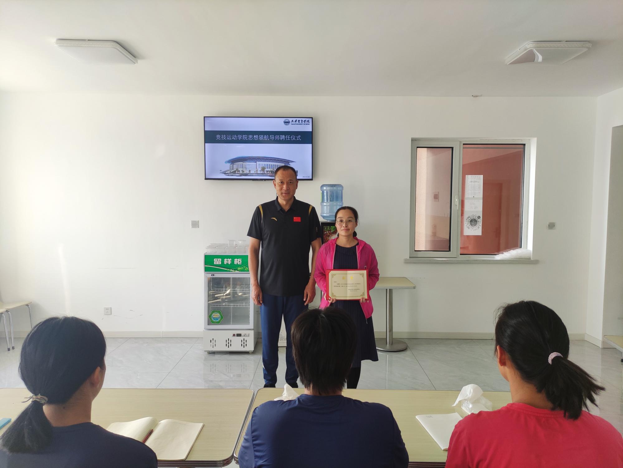 竞技运动学院聘请马克思主义学院教师马振叶为思想领航导师,竞技运动学院副院长聂军良为马振叶颁发聘书。马振叶为赛艇队运动员讲授专题思政课。她从国之大者的角度讲述了当代体育人肩负的历史使命,希望赛艇队的青年运动员们以体育强国为己任,努力拼搏,以优异的运动成绩为健康中国、体育强国建设贡献力量。