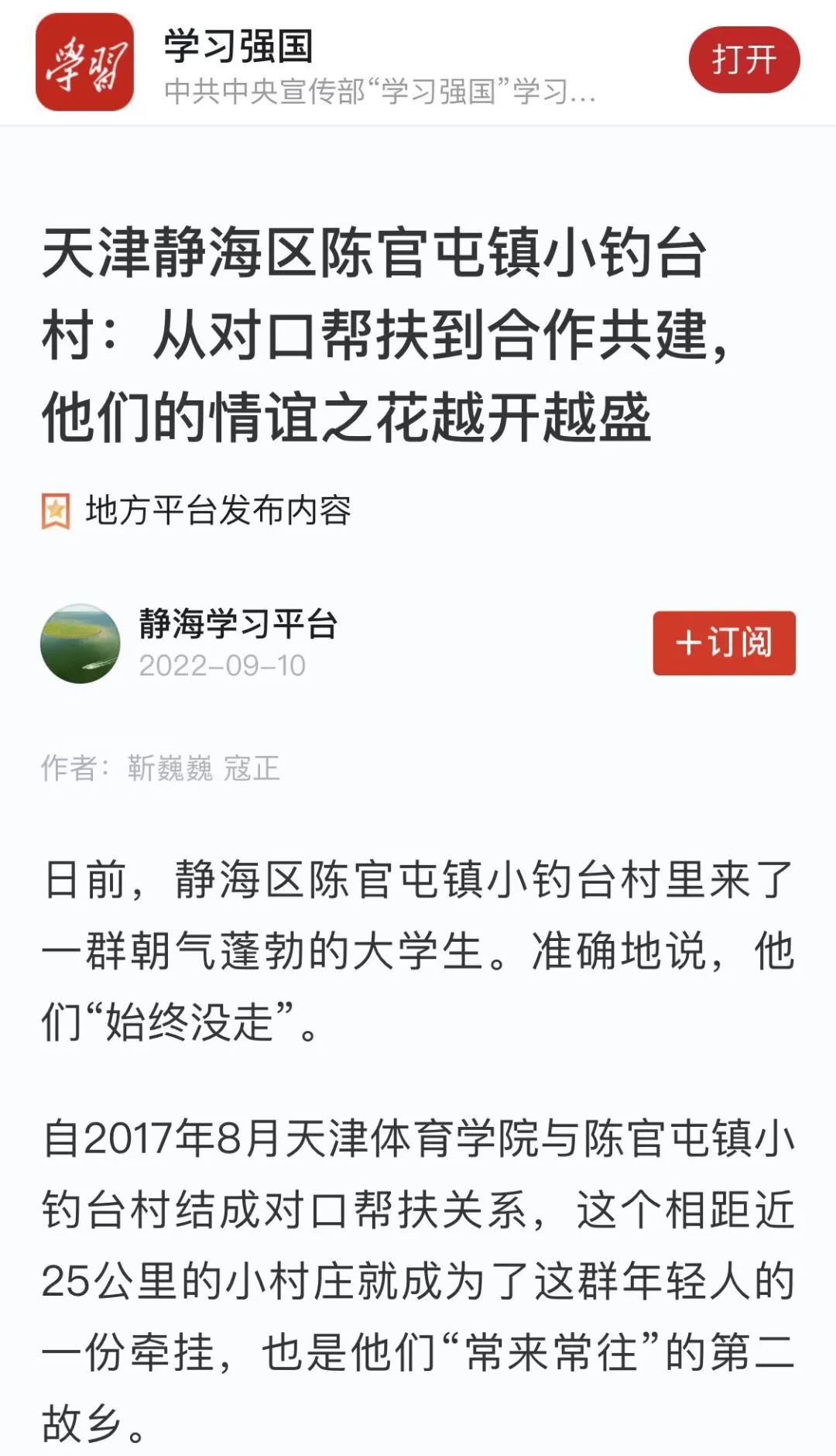 9月10日,学习强国报道sunbet申搏与静海区陈官屯镇小钓台村深化合作共建,积极探索乡村振兴共建发展新模式,sunbet申搏师生发挥特长优势,助力乡村振兴。