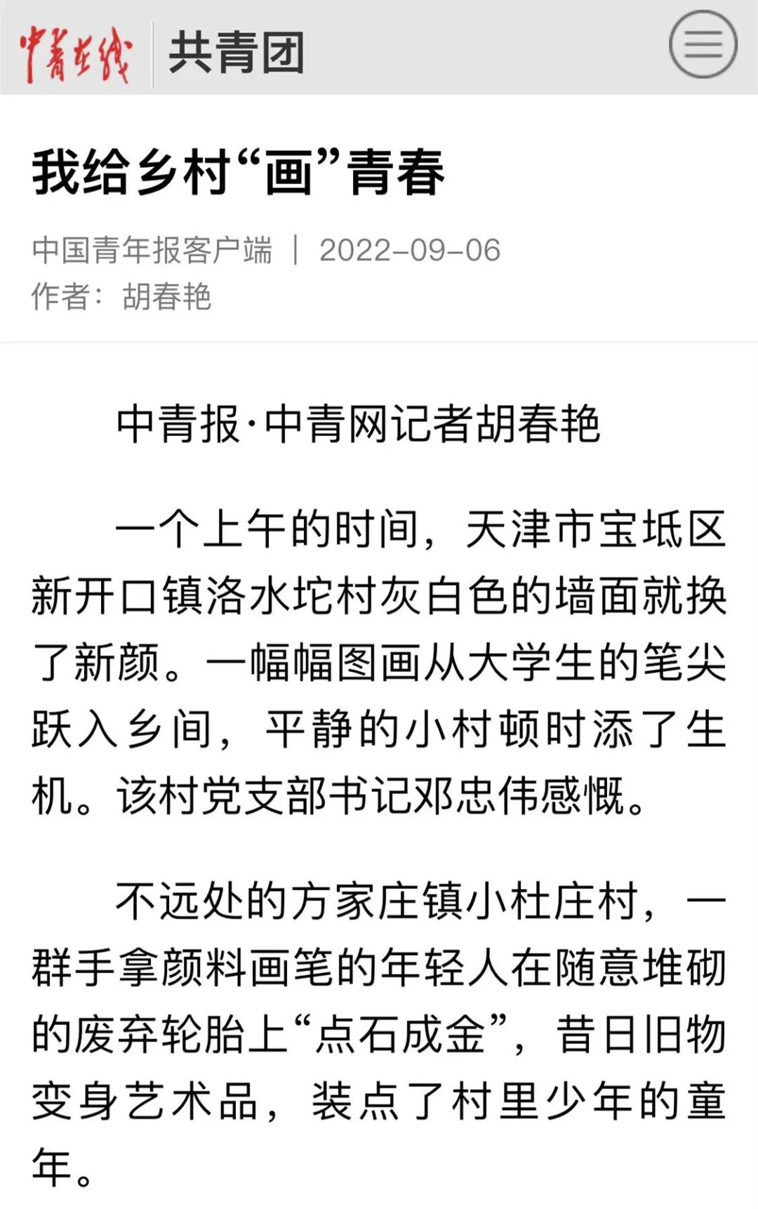 日前,中国青年报客户端报道sunbet申搏社会实践团的师生们走出课堂,来到乡村,围绕乡村振兴,以“青山绿水、家禽嬉戏、五谷丰登”为主题,将对美丽乡村的无尽畅想搬上墙面,激发乡村发展新活力。
