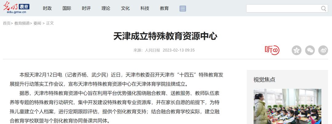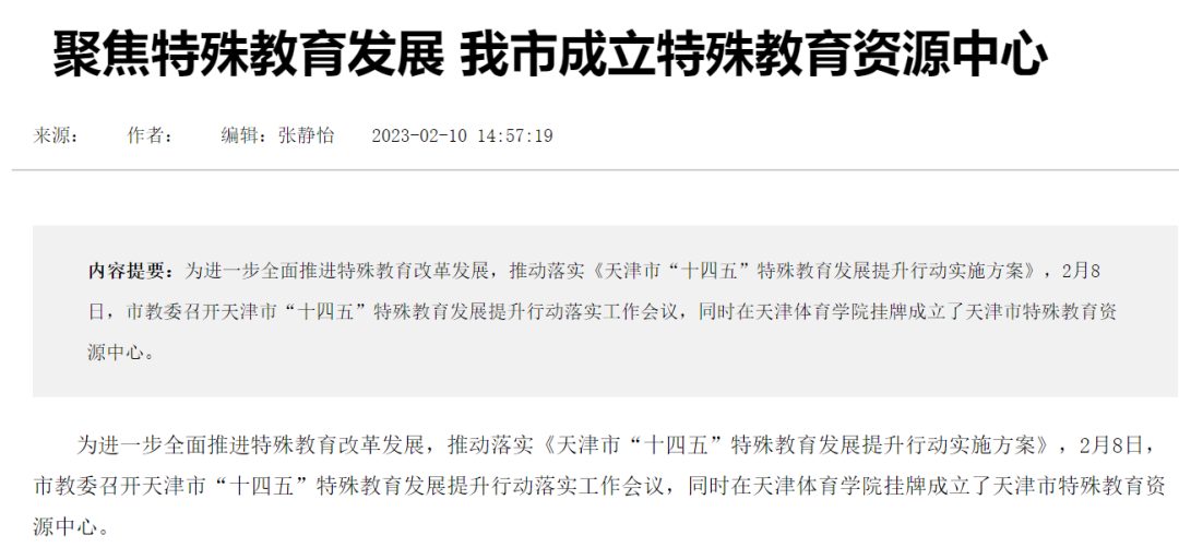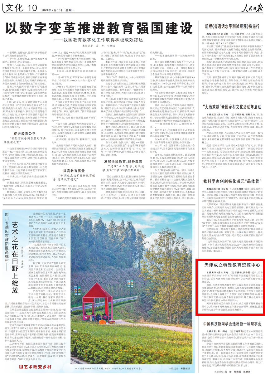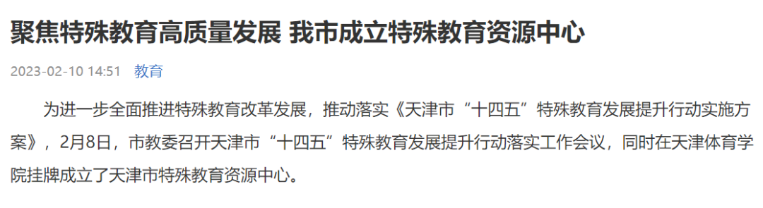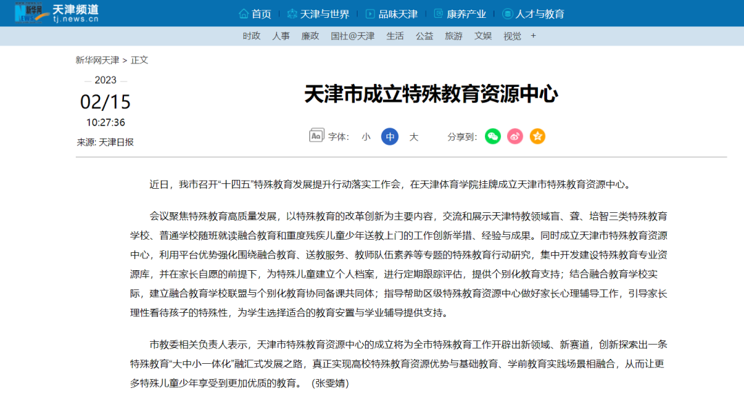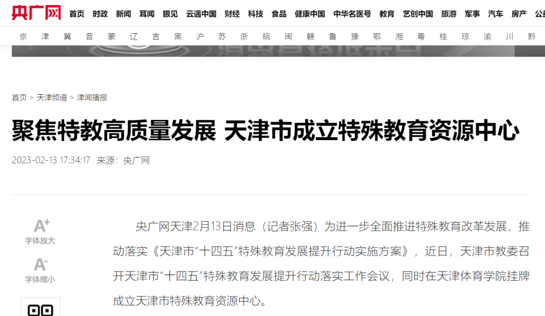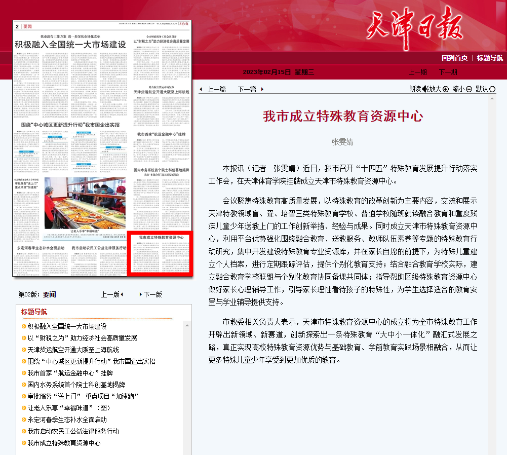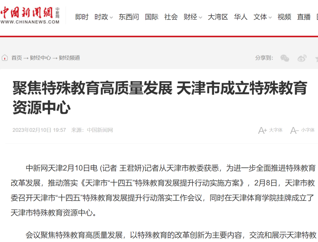 日前,天津市教委召开天津市“十四五”特殊教育发展提升行动落实工作会议,并在sunbet申搏挂牌成立了天津市特殊教育资源中心。《人民日报》、新华网、央广网、光明网、学习强国、中国新闻网、《天津日报》、津云、北方网、《天津教育报》等中央和我市多家媒体进行了报道。