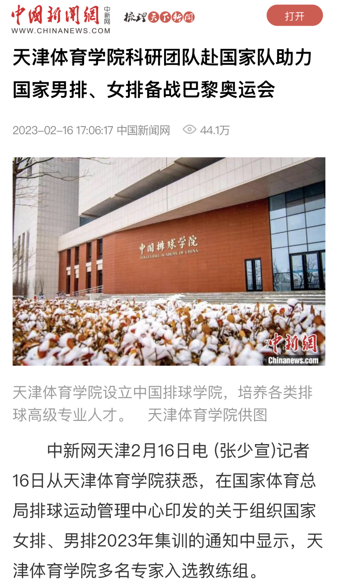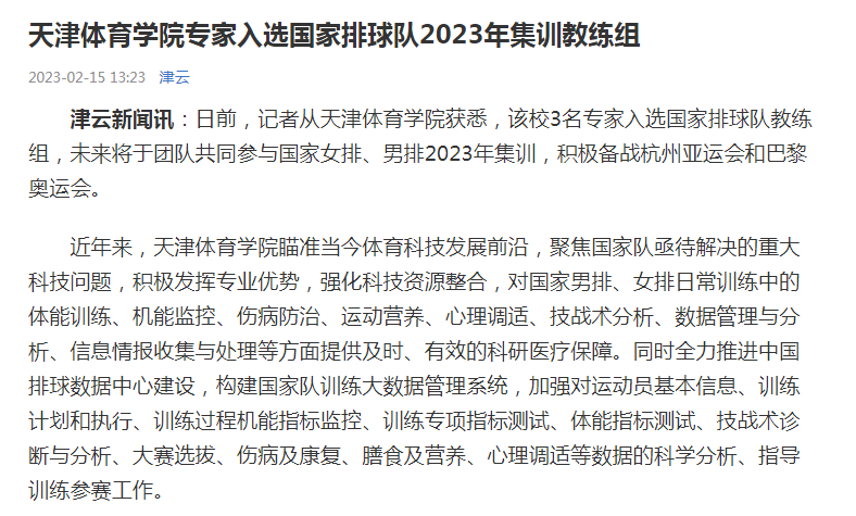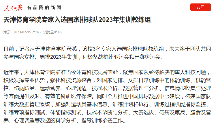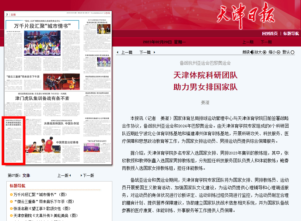 近日,人民日报客户端、中国新闻网、《天津日报》、津云、《天津教育报》等中央和我市多家媒体对sunbet申搏科研团队全面助力国家男排、女排备战巴黎奥运会进行了报道。