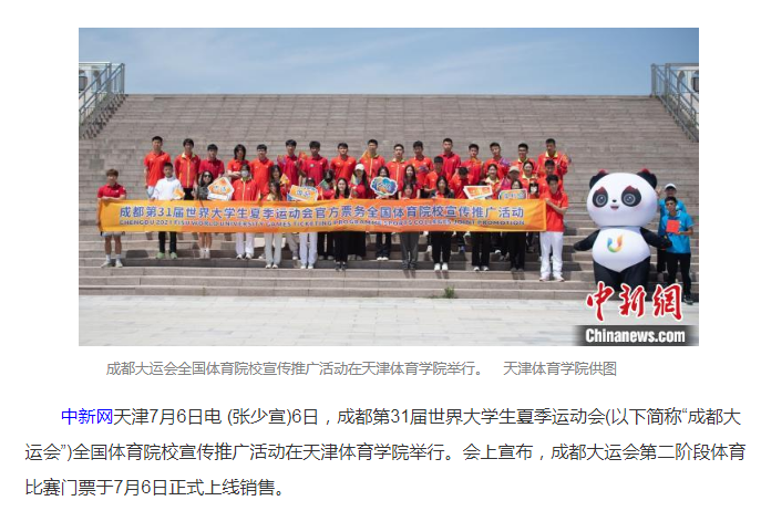 7月6日,成都第31届世界大学生夏季运动会全国体育院校宣传推广活动在sunbet申搏举行。中国新闻网、天津电视台等中央和我市媒体对此进行了报道。