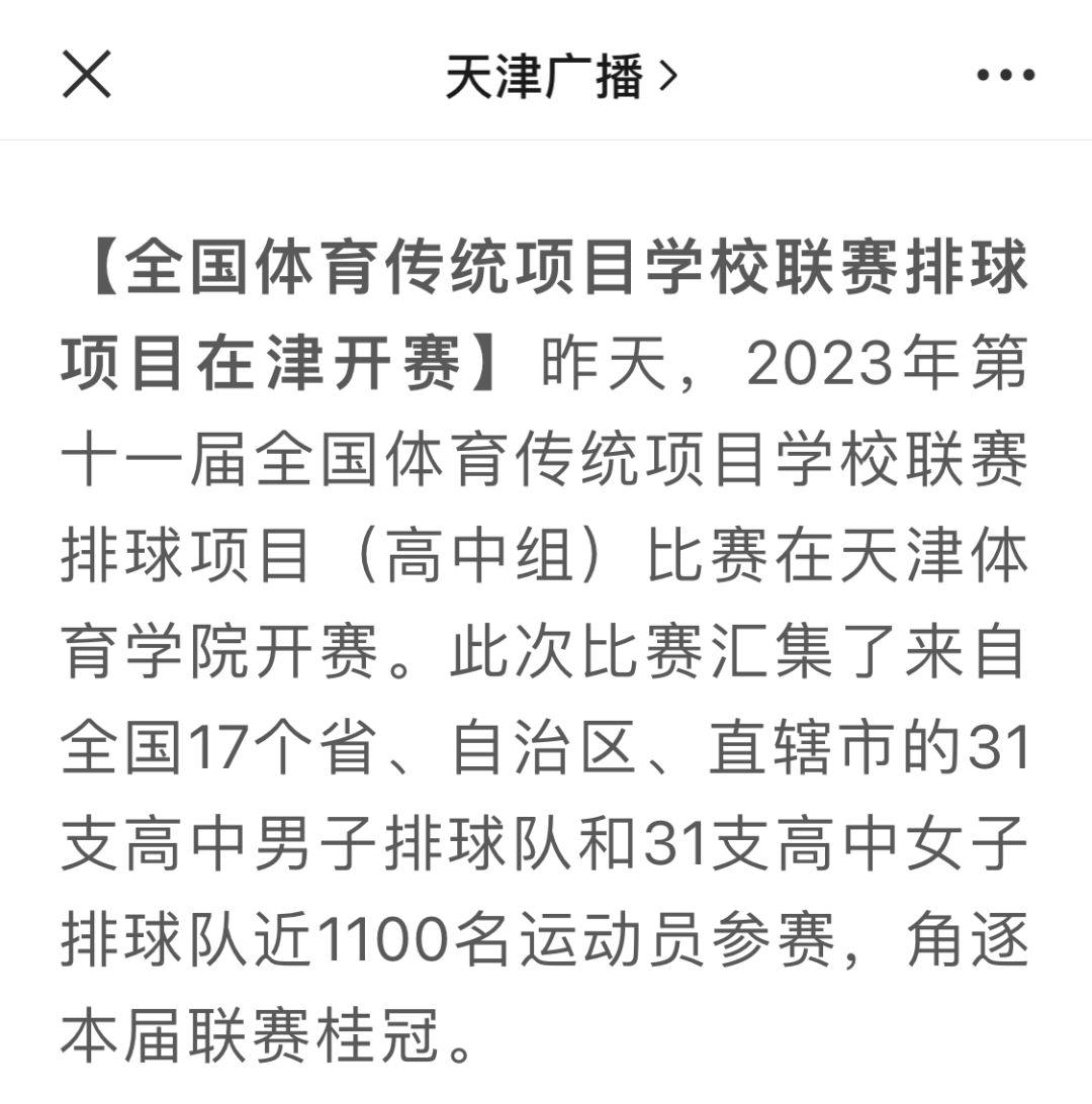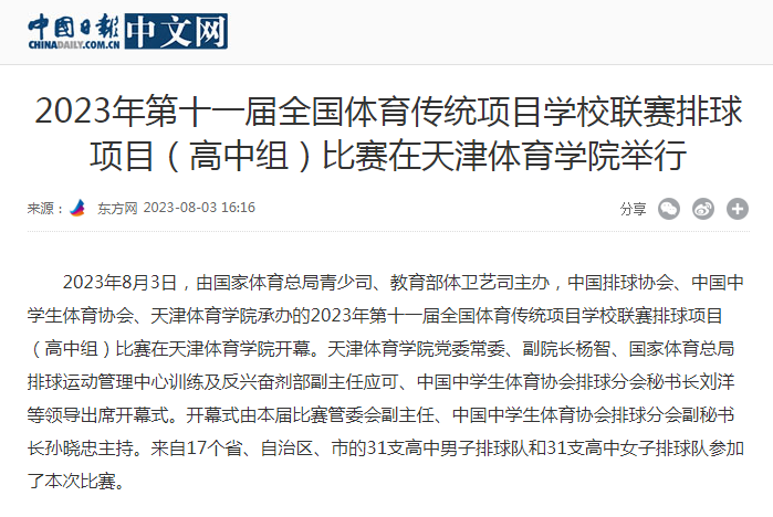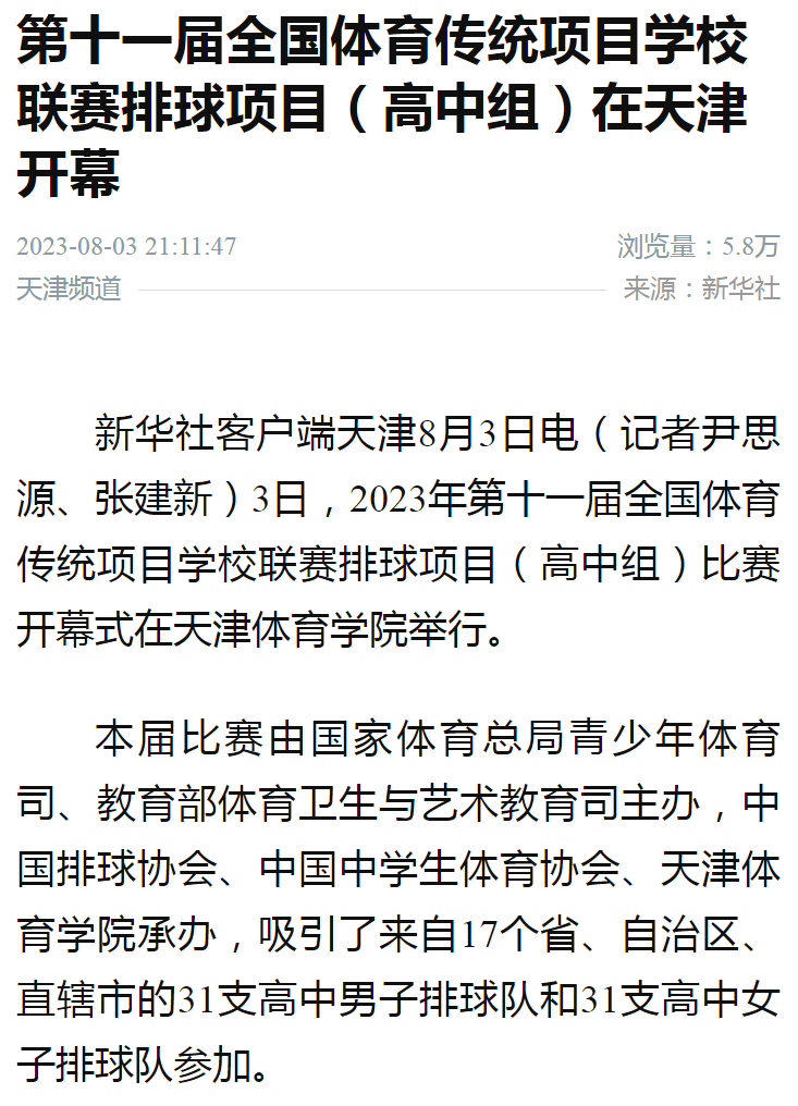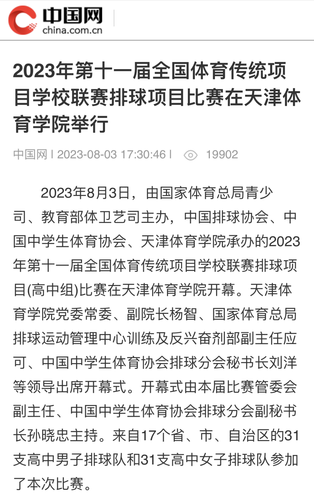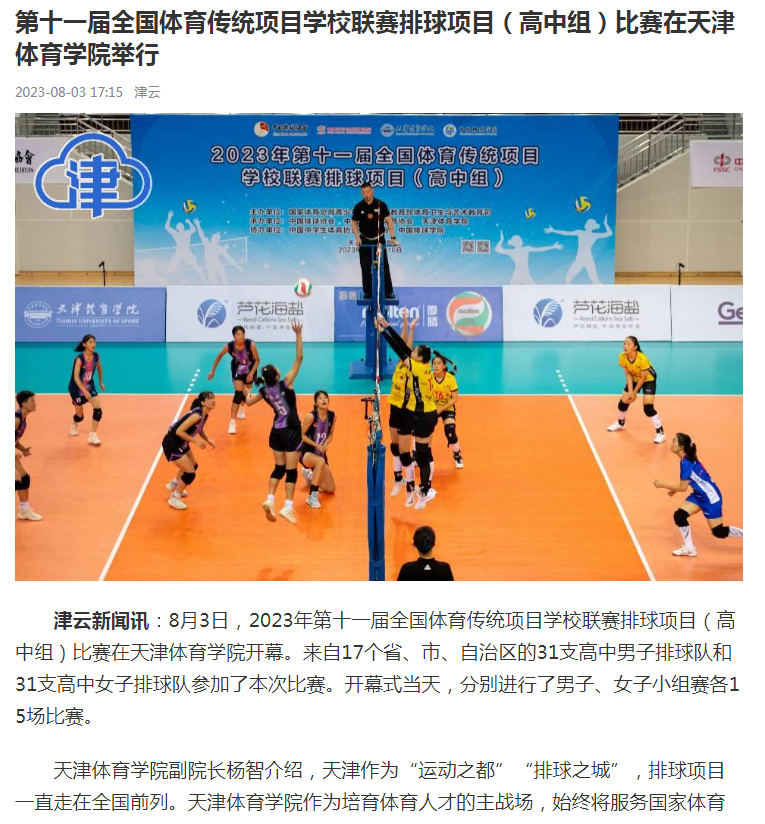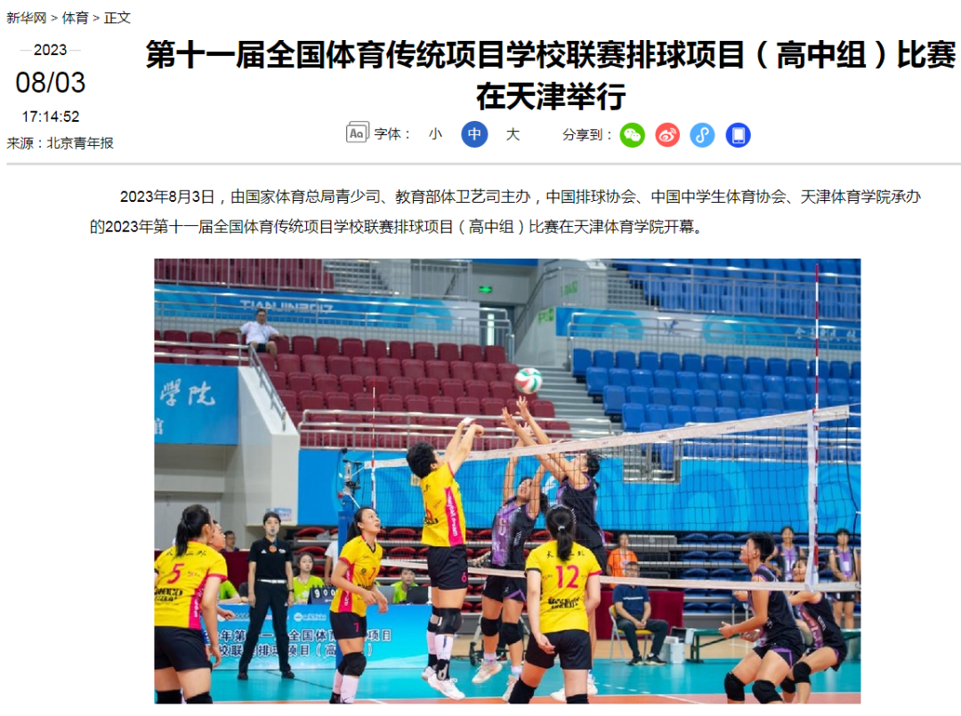 2023年8月3日,由国家体育总局青少司、教育部体卫艺司主办,中国排球协会、中国中学生体育协会、sunbet申搏官方网站承办的2023年第十一届全国体育传统项目学校联赛排球项目(高中组)比赛在sunbet申搏官方网站开幕。来自17个省、自治区、直辖市的31支高中男子排球队和31支高中女子排球队参加了本次比赛。新华社、新华网、中国网、中国日报、光明网、《天津日报》、津云、天津广播、天津教育报新媒体、天津教育新媒体等中央和我市多家媒体对此进行了报道。