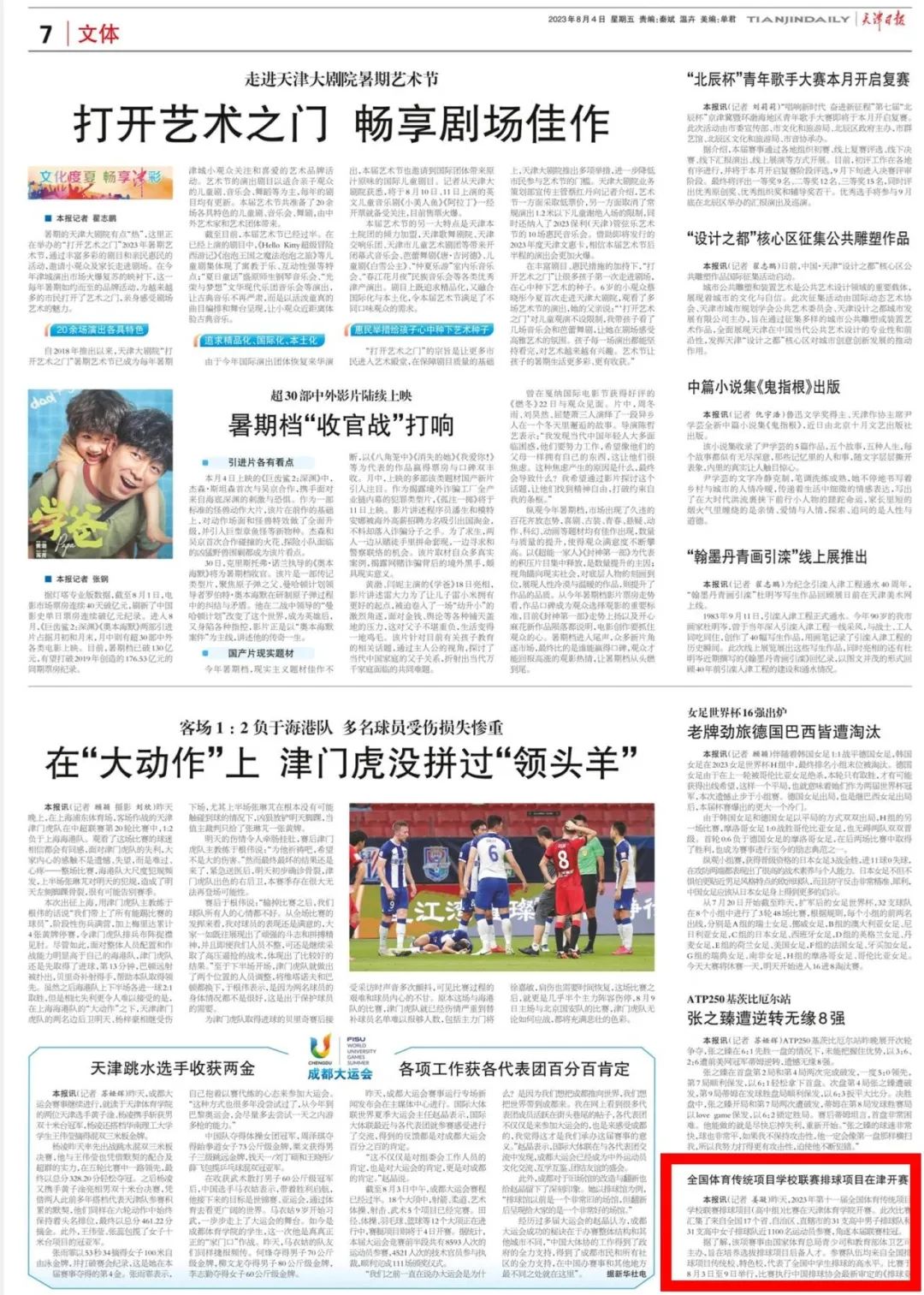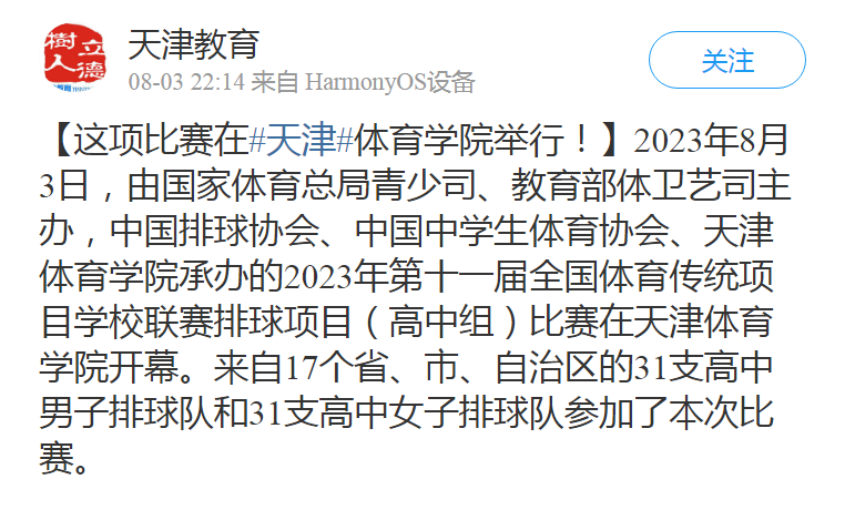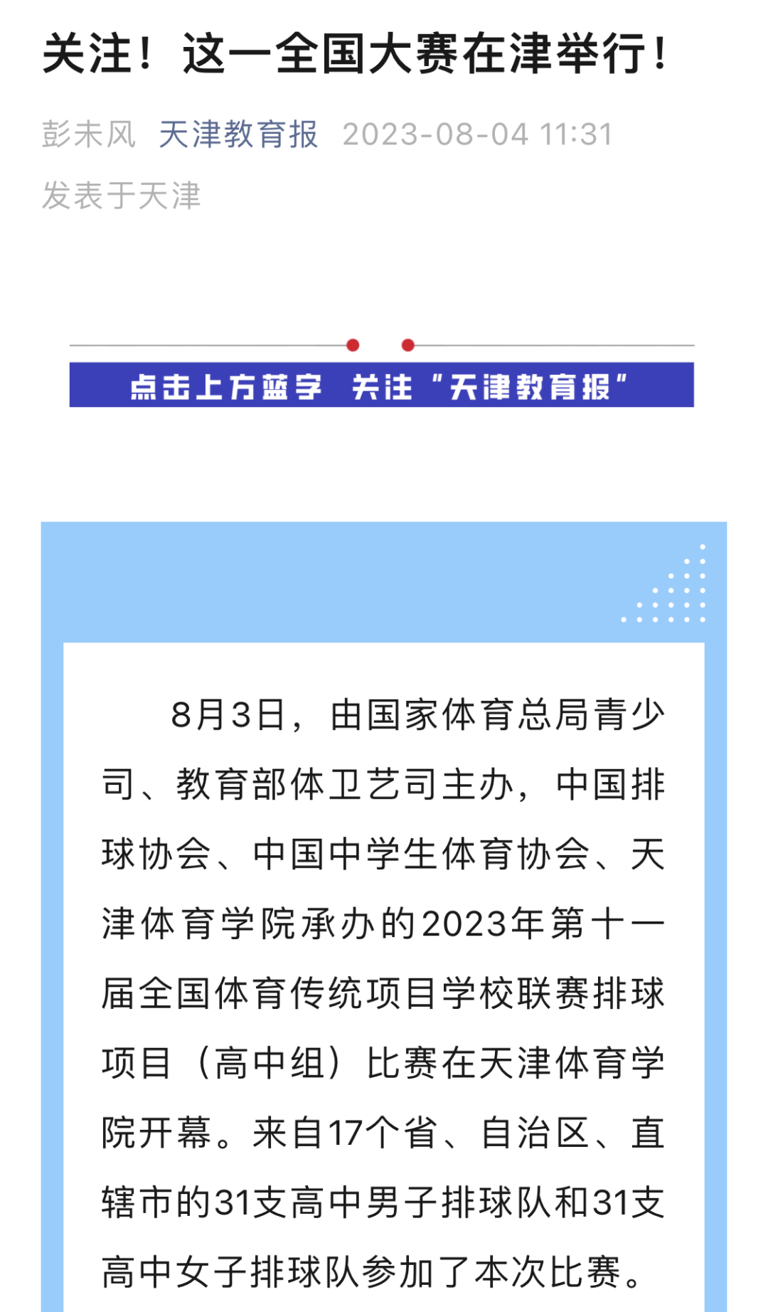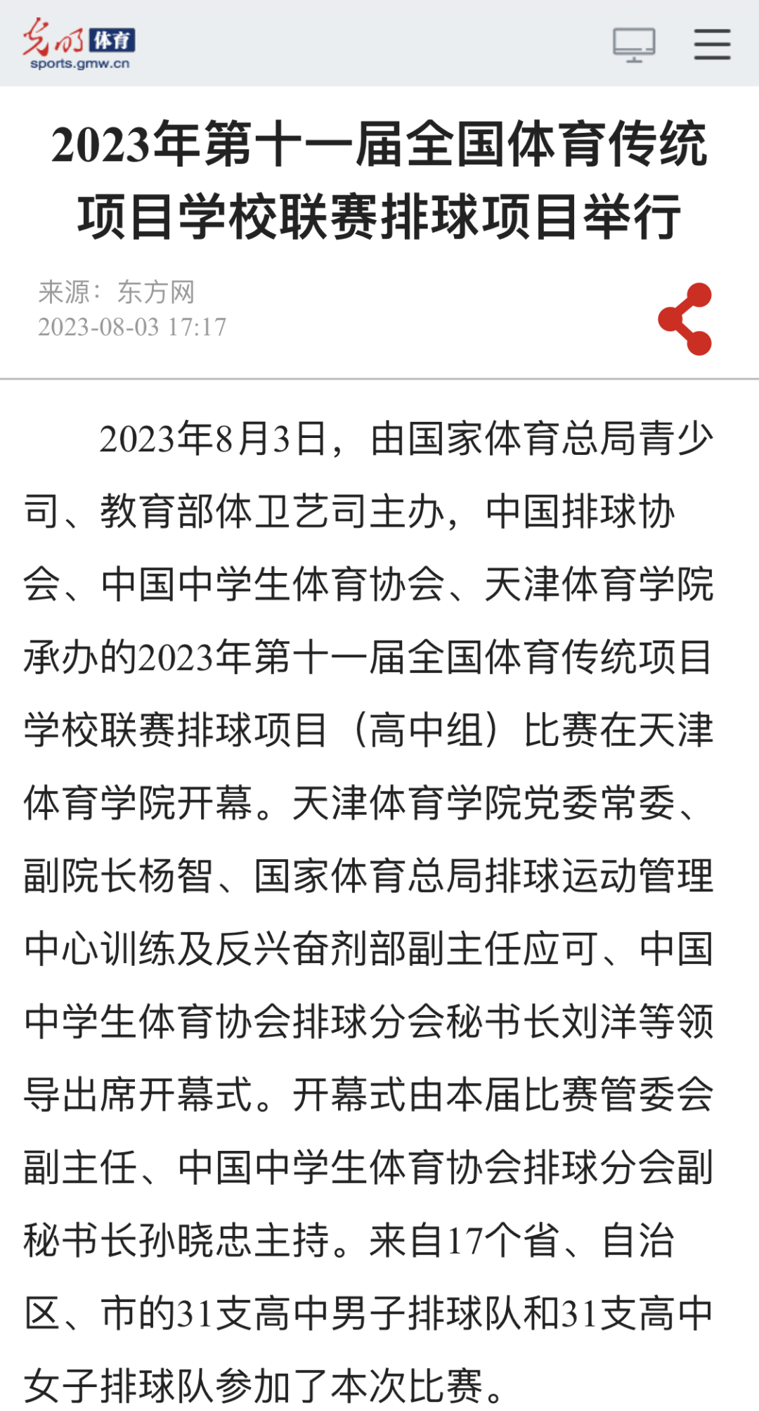 2023年8月3日,由国家体育总局青少司、教育部体卫艺司主办,中国排球协会、中国中学生体育协会、sunbet申搏官方网站承办的2023年第十一届全国体育传统项目学校联赛排球项目(高中组)比赛在sunbet申搏官方网站开幕。来自17个省、自治区、直辖市的31支高中男子排球队和31支高中女子排球队参加了本次比赛。新华社、新华网、中国网、中国日报、光明网、《天津日报》、津云、天津广播、天津教育报新媒体、天津教育新媒体等中央和我市多家媒体对此进行了报道。