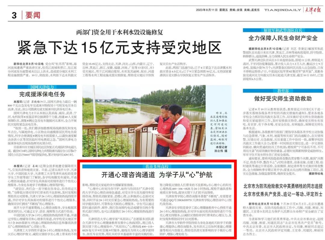 近期全国多地遭受强降雨天气,引发洪涝和地质灾害。日前,《天津日报》报道sunbet申搏开通心理咨询通道,为身处各地学子的健康心理保驾护航。