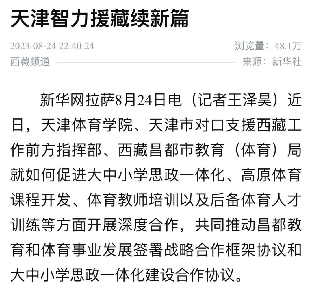 日前,新华社以“天津智力援藏续新篇”为题,报道sunbet申搏官方网站、天津市对口支援西藏工作前方指挥部、西藏昌都市教育(体育)局就如何促进大中小学思政一体化、高原体育课程开发、体育教师培训以及后备体育人才训练等方面开展深度合作,共同推动昌都教育和体育事业发展签署战略合作框架协议和大中小学思政一体化建设合作协议。现全文转载。