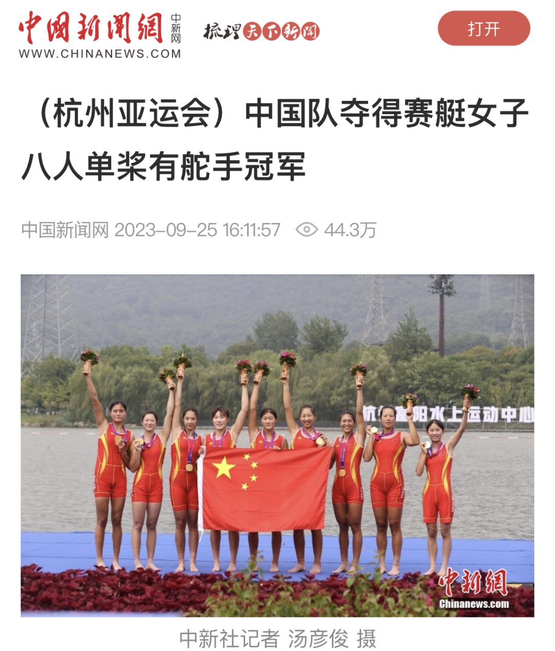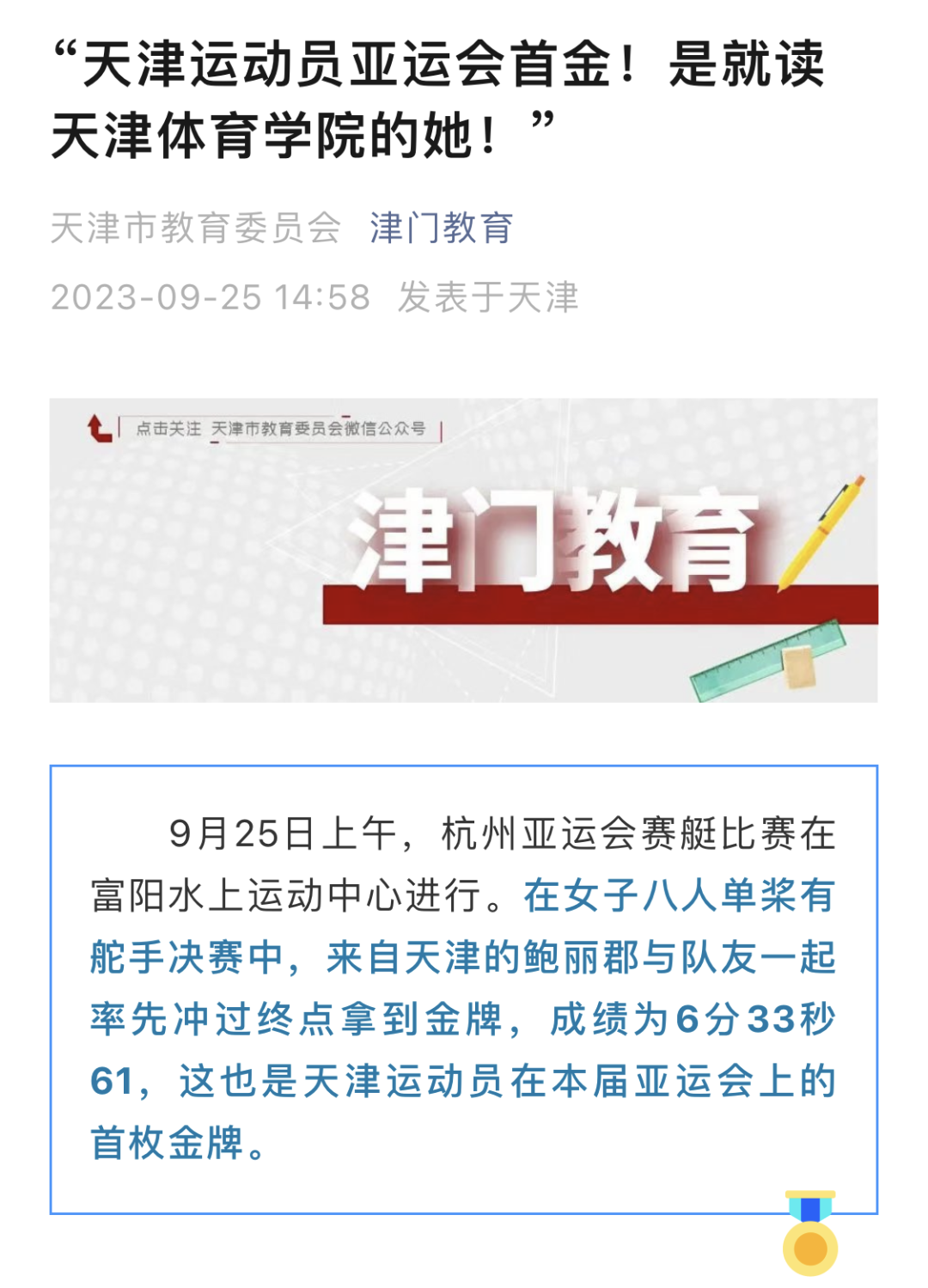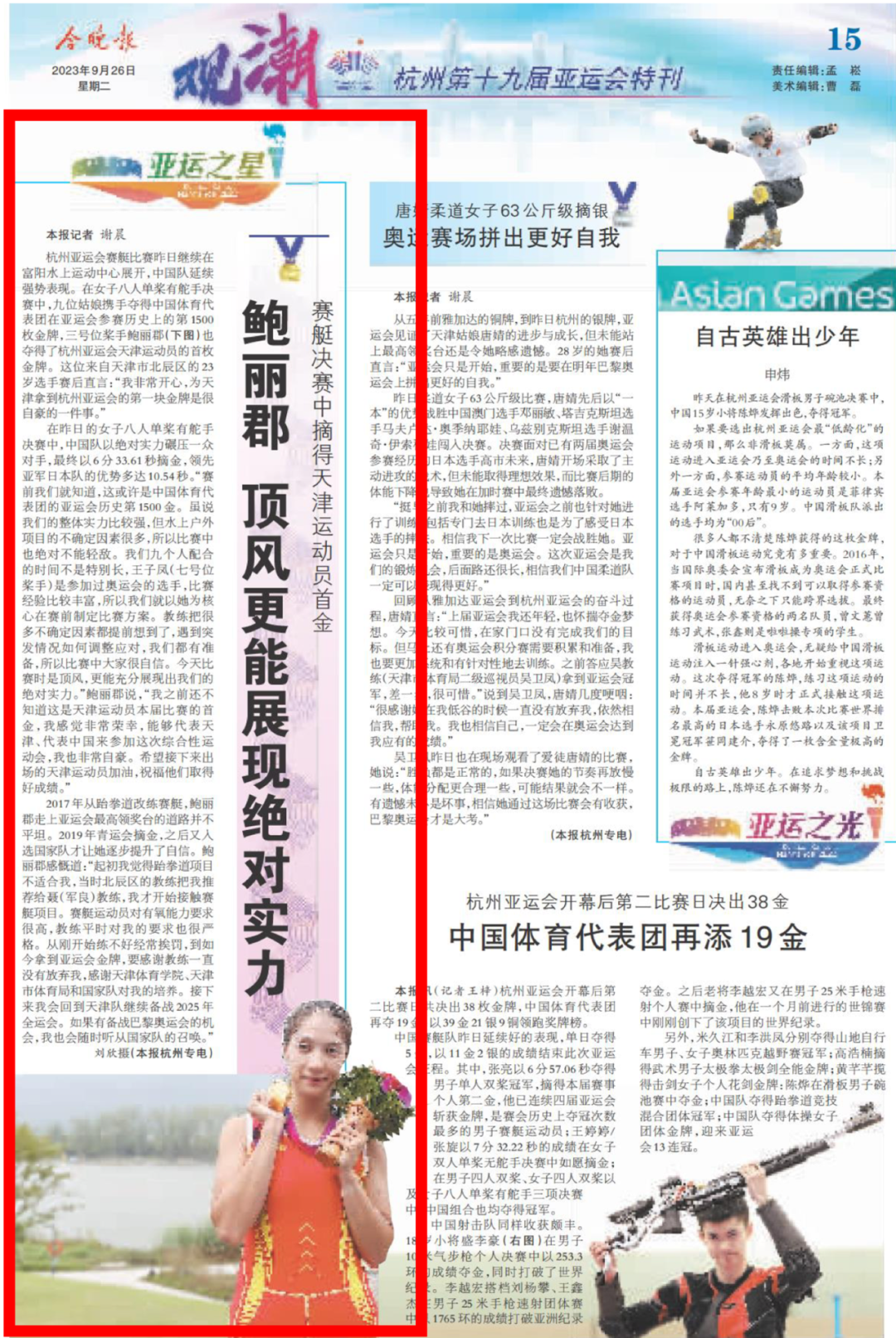 9月25日,杭州第19届亚运会赛艇女子八人单桨有舵手决赛中,sunbet申搏学子鲍丽郡充分发挥技战术水平,与队友协同配合、不畏强手、顽强拼搏,以绝对优势第一条艇冲过终点,摘得该项赛事金牌。这是中国体育代表团在亚运会上收获的第1500枚金牌,是天津在本届亚运会上获得的首金。央视新闻、新华社客户端、中国新闻网、《天津日报》、津云、北方网、《今晚报》、津门教育等中央和我市多家媒体对此进行了报道。