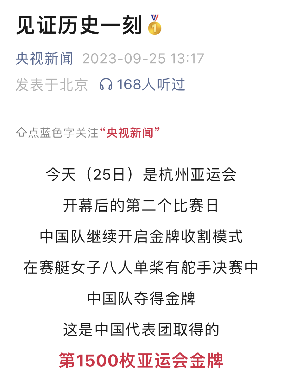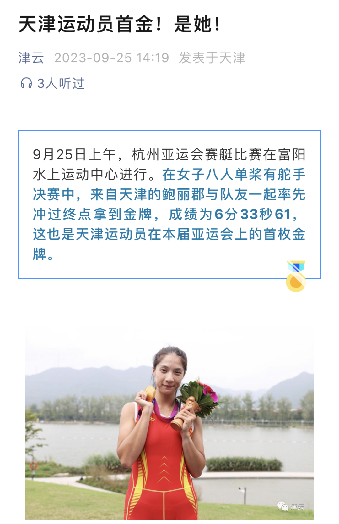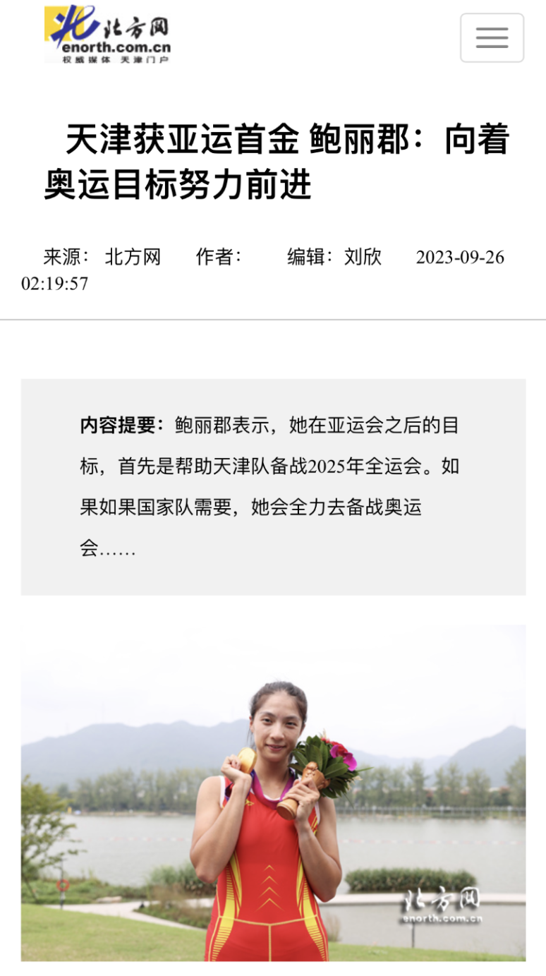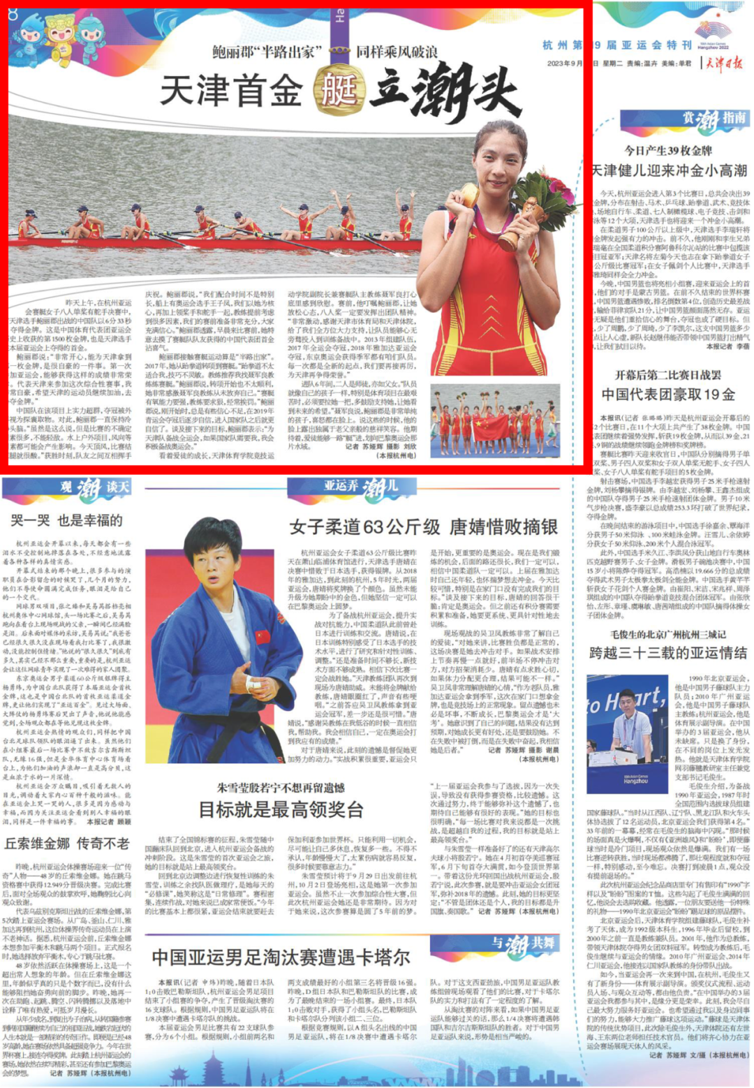 9月25日,杭州第19届亚运会赛艇女子八人单桨有舵手决赛中,sunbet申搏学子鲍丽郡充分发挥技战术水平,与队友协同配合、不畏强手、顽强拼搏,以绝对优势第一条艇冲过终点,摘得该项赛事金牌。这是中国体育代表团在亚运会上收获的第1500枚金牌,是天津在本届亚运会上获得的首金。央视新闻、新华社客户端、中国新闻网、《天津日报》、津云、北方网、《今晚报》、津门教育等中央和我市多家媒体对此进行了报道。