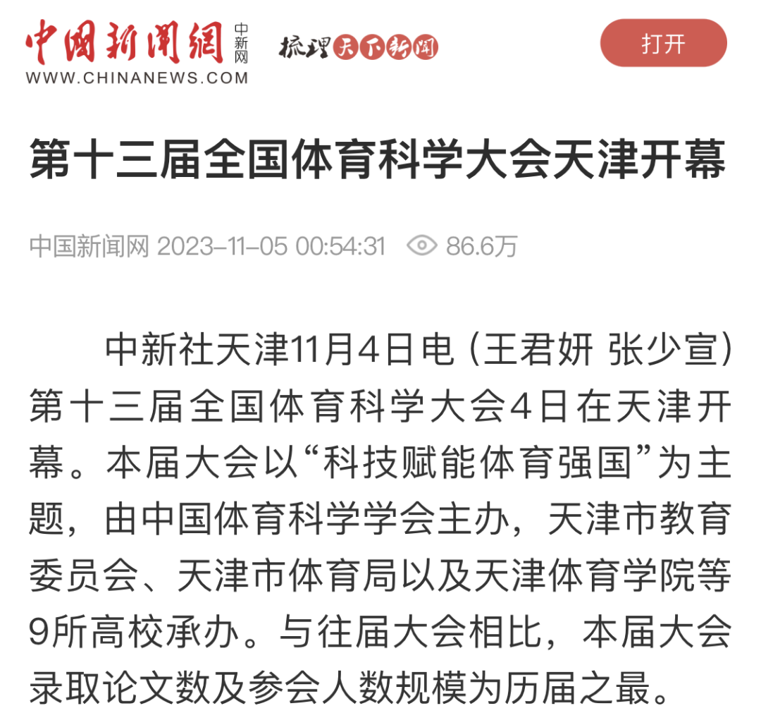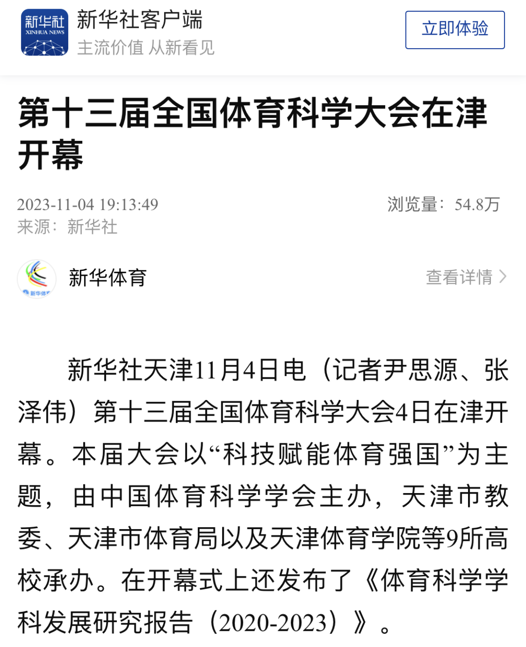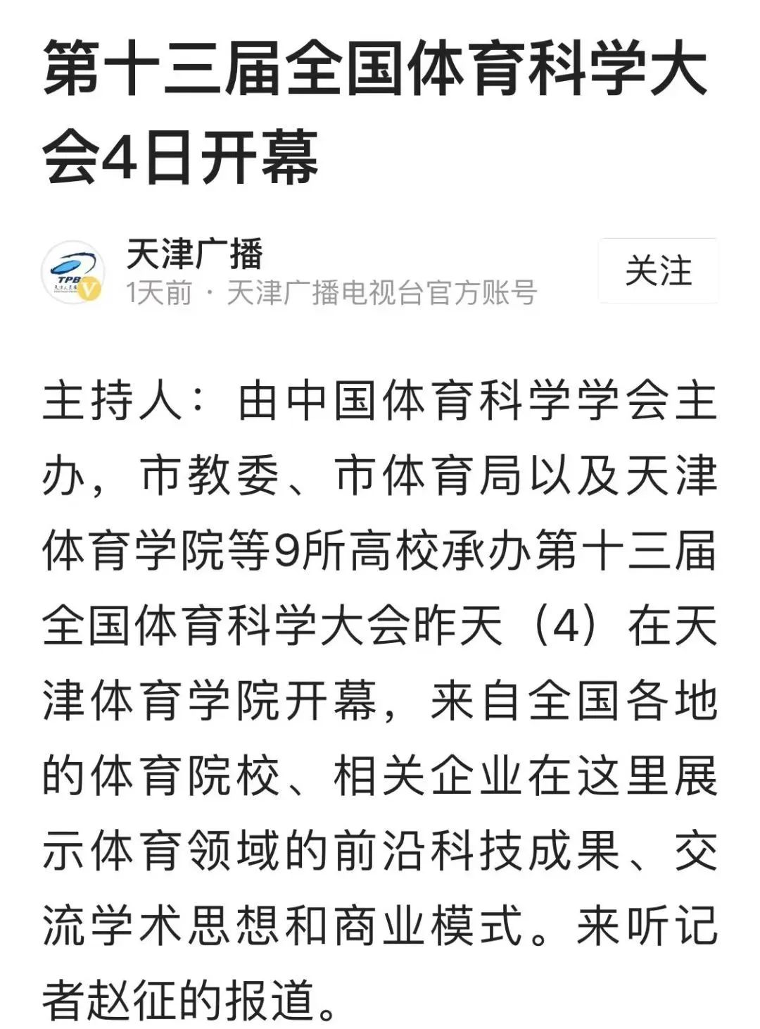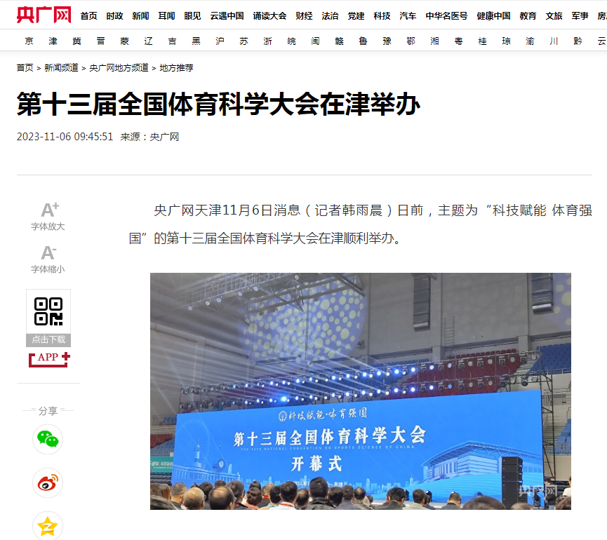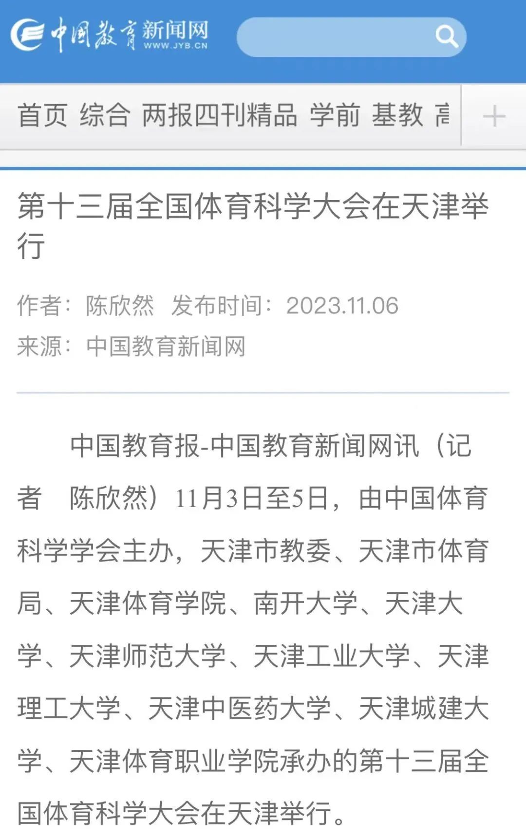 11月3日-5日,由中国体育科学学会主办,天津市教委、天津市体育局、sunbet申搏官方网站、南开大学、天津大学、天津师范大学、天津工业大学、天津理工大学、天津中医药大学、天津城建大学、天津体育职业学院承办的第十三届全国体育科学大会在天津圆满举行。连日来,新华社、央广网、中国新闻网、《中国体育报》、中国教育新闻网、国家体育总局、天津电视台、《天津日报》、津云、天津广播等中央和我市多家媒体对此进行了报道。