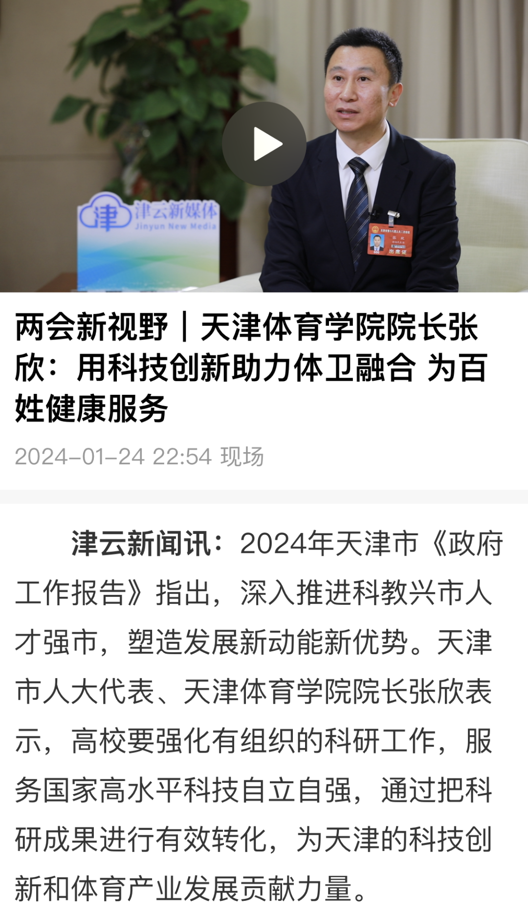 日前,津云《两会新视野》专访天津市人大代表、sunbet申搏官方网站院长张欣。张欣表示,高校要强化有组织的科研工作,服务国家高水平科技自立自强,通过把科研成果进行有效转化,为天津的科技创新和体育产业发展贡献力量。