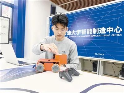 走进位于天津大学北洋园校区的天津大学智能制造中心,未来技术学院2022级本科生常响正操控着他亲手设计建造的“智能循迹投放车”一遍遍记录数据参数,以便更好地进行方案改进。