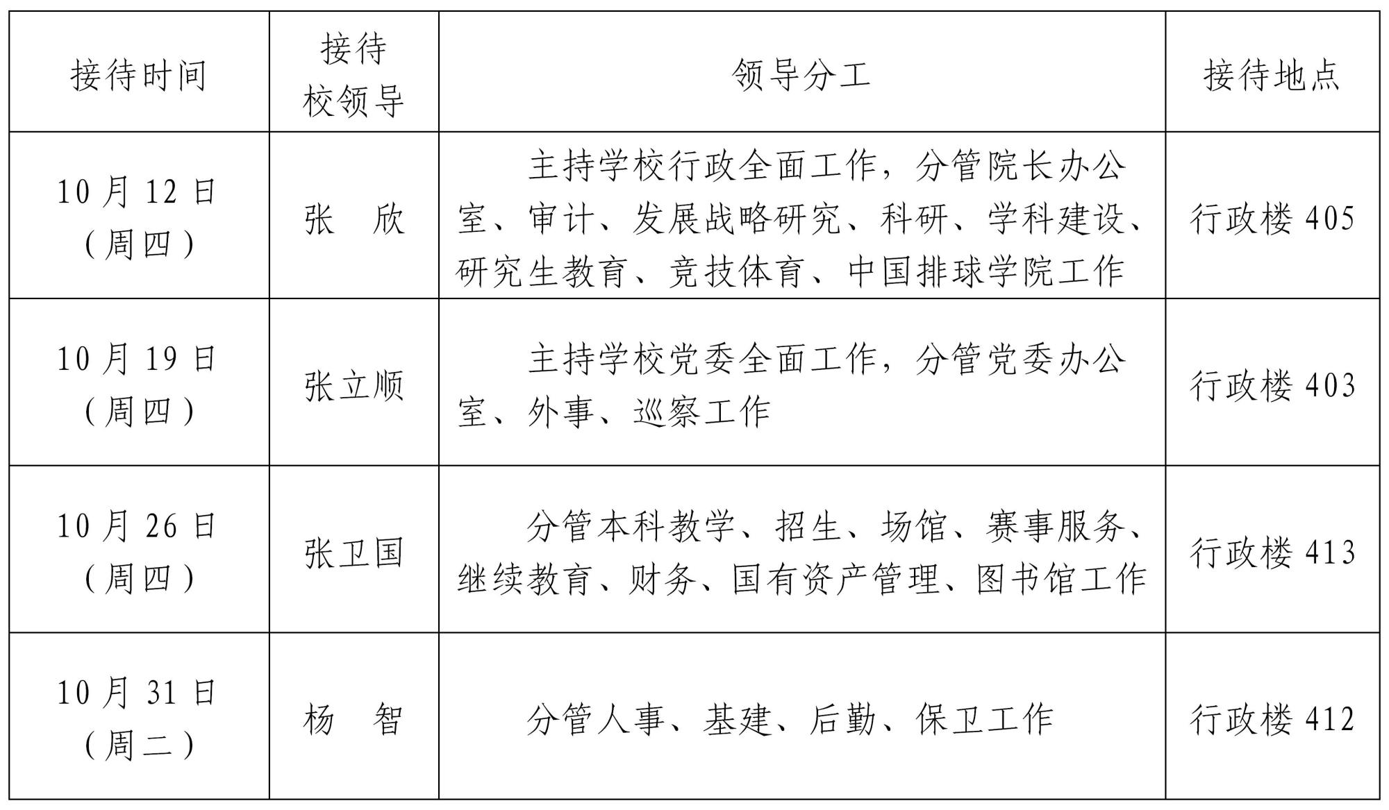 根据《sunbet申搏官方网站领导干部接待日制度》规定及学校近期工作安排,现将2023年10月校领导接待师生来访安排通知如下: