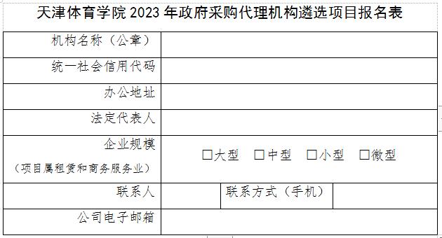 政府采购代理机构拟报名参加本项目的,请于2023年11月23日前,将《sunbet申搏官方网站2023年政府采购代理机构遴选项目报名表》(详见附件)扫描件发送至电子邮箱(邮箱地址:gzc@tjus.edu.cn)。