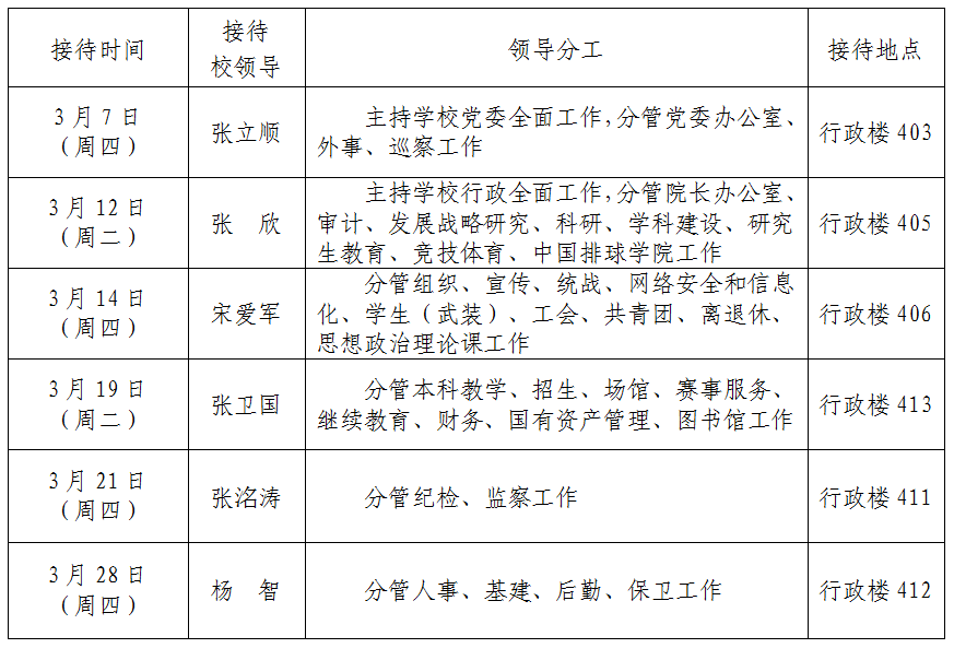 根据《sunbet申搏官方网站领导干部接待日制度》规定及学校近期工作安排,现将2024年3月校领导接待师生来访安排通知如下: