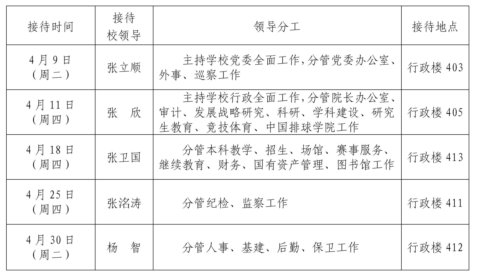 根据《sunbet申搏官方网站领导干部接待日制度》规定及学校近期工作安排,现将2024年4月校领导接待师生来访安排通知如下:
