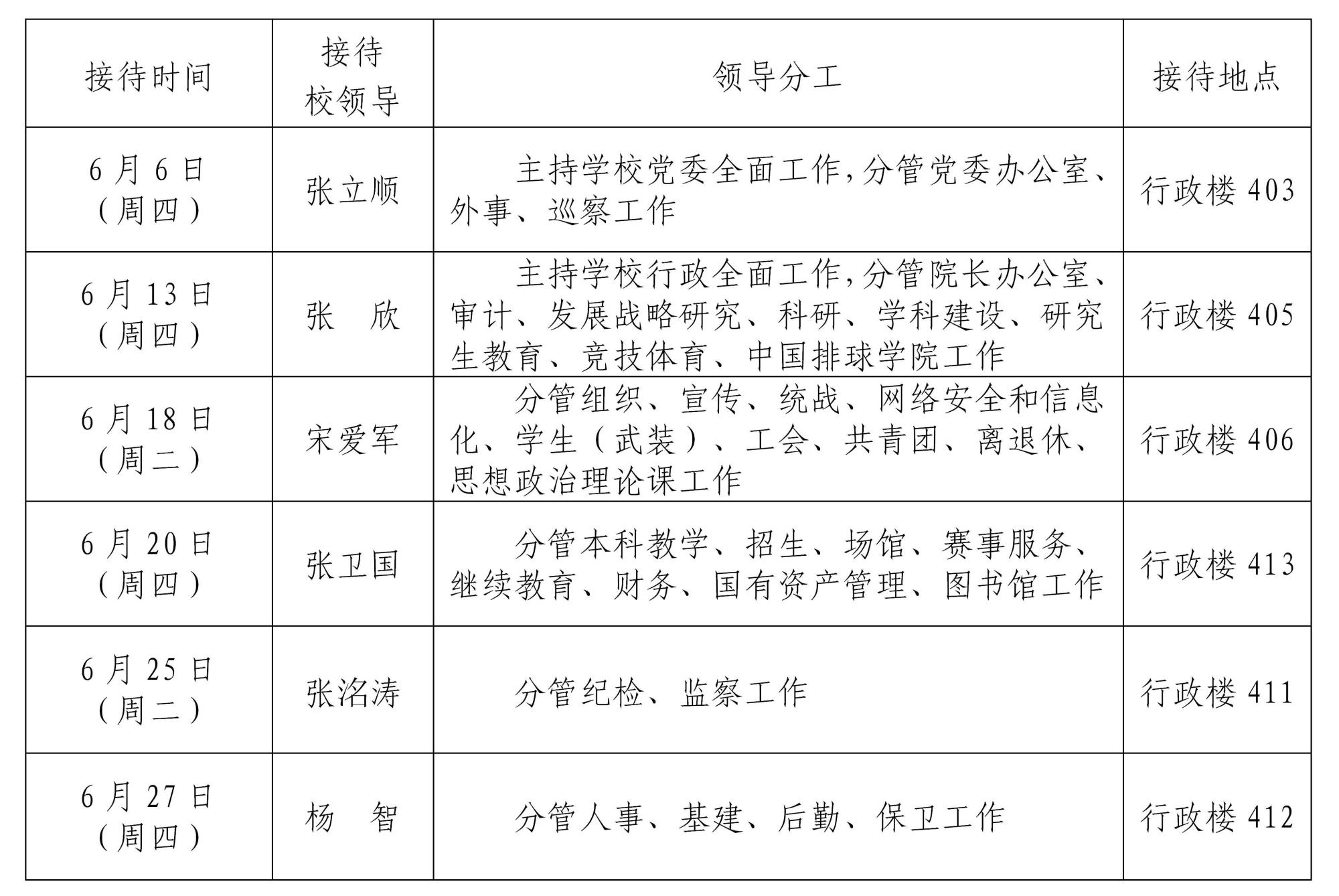 根据《sunbet申搏官方网站领导干部接待日制度》规定及学校近期工作安排,现将2024年6月校领导接待师生来访安排通知如下:
